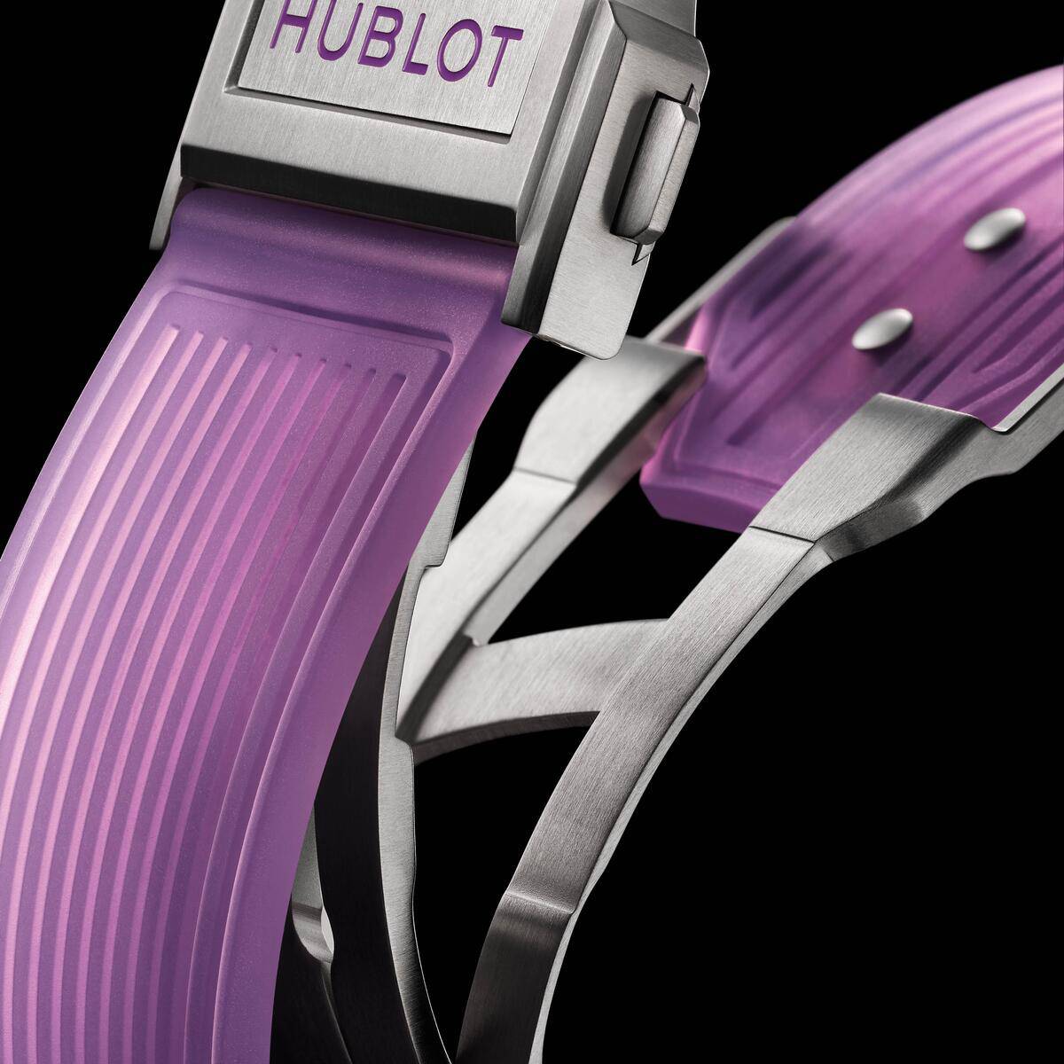 The translucent purple sapphire case is a world's first, a completely new colour in the field of fine watchmaking and it now adorns a second coveted model from Hublot - cementing its position as a disruptive force in the field of watchmaking. This new purple tint is a composite made of Al₂O₃ (aluminium oxyde) and chrome, with the case and movement blending together seamlessly.