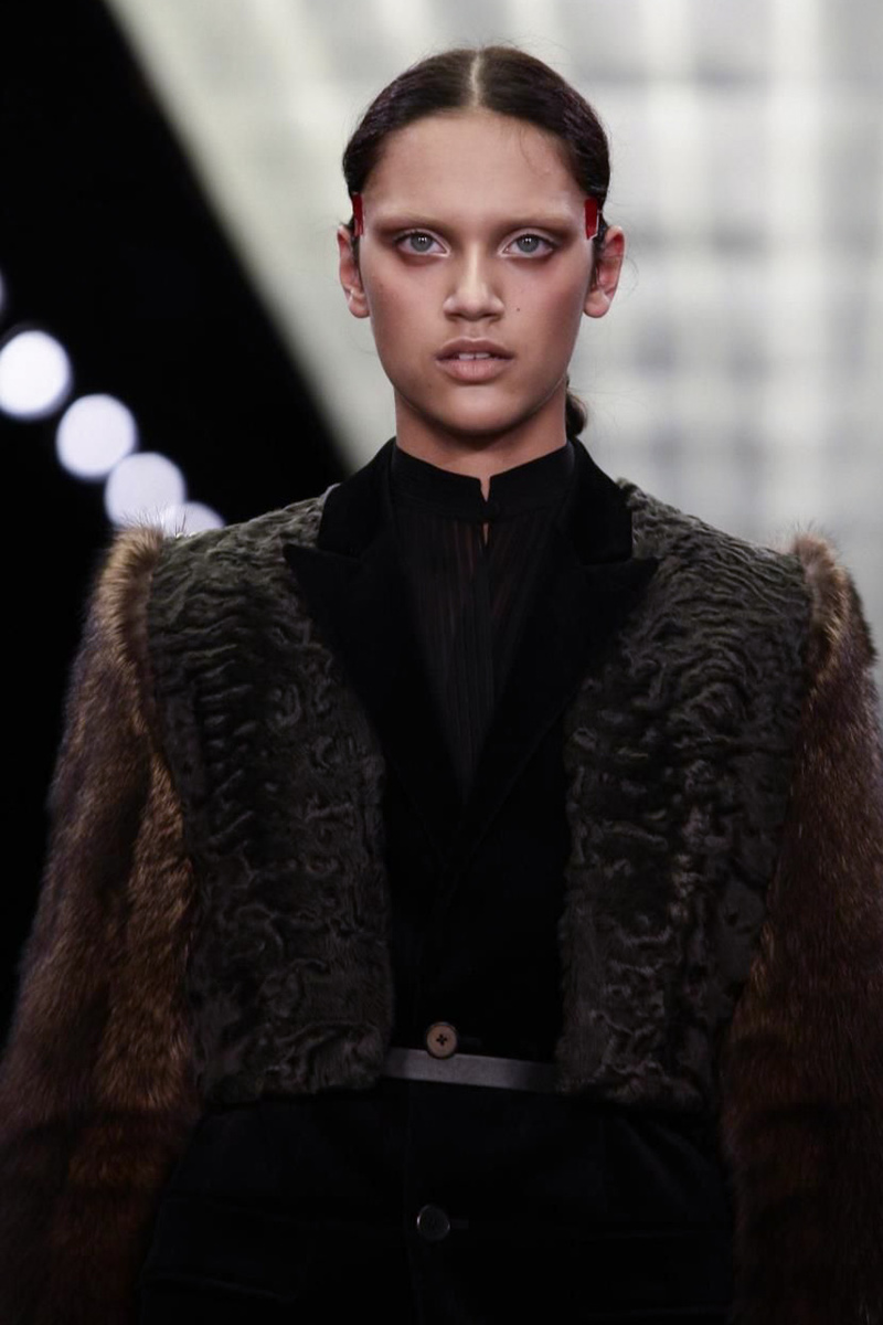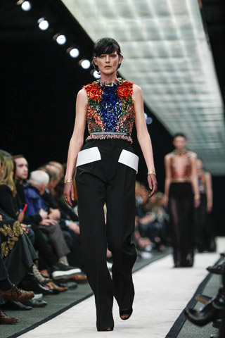 Glam was in for Givenchy’s fall-winter 2014 runway show presented Sunday at Paris Fashion Week. The collection saw creative director Riccardo Tisci moving away from the street wear inspired aesthetic that has been so entrenched in the label for the past few seasons. Instead, the Givenchy woman is given a more ladylike makeover for autumn, but it is not stuffy by any means. Silk blouses with soft pleats, knee-length dresses of the same material and puffy fur coats dominate the fall preview. Pattern takes shape in the form of animal prints and butterfly-inspired motifs which add another dimension to the designs.