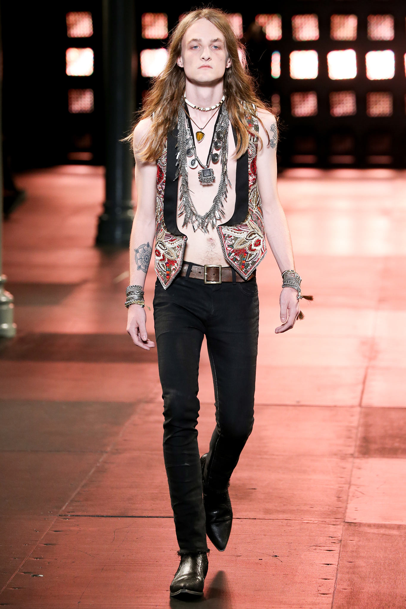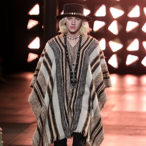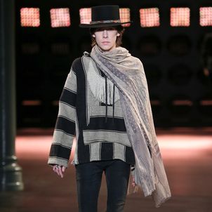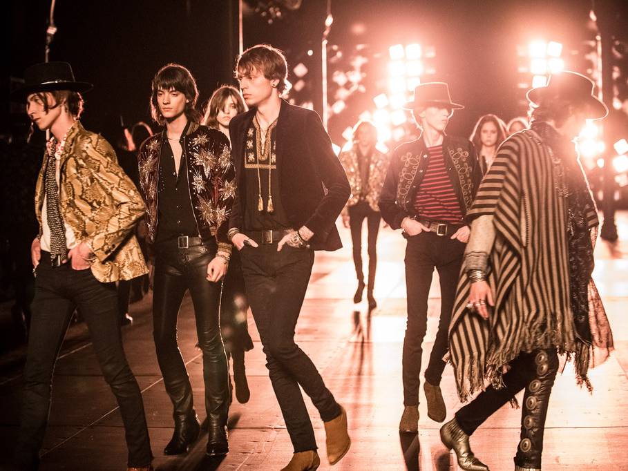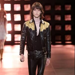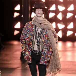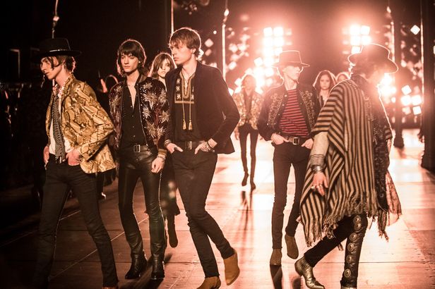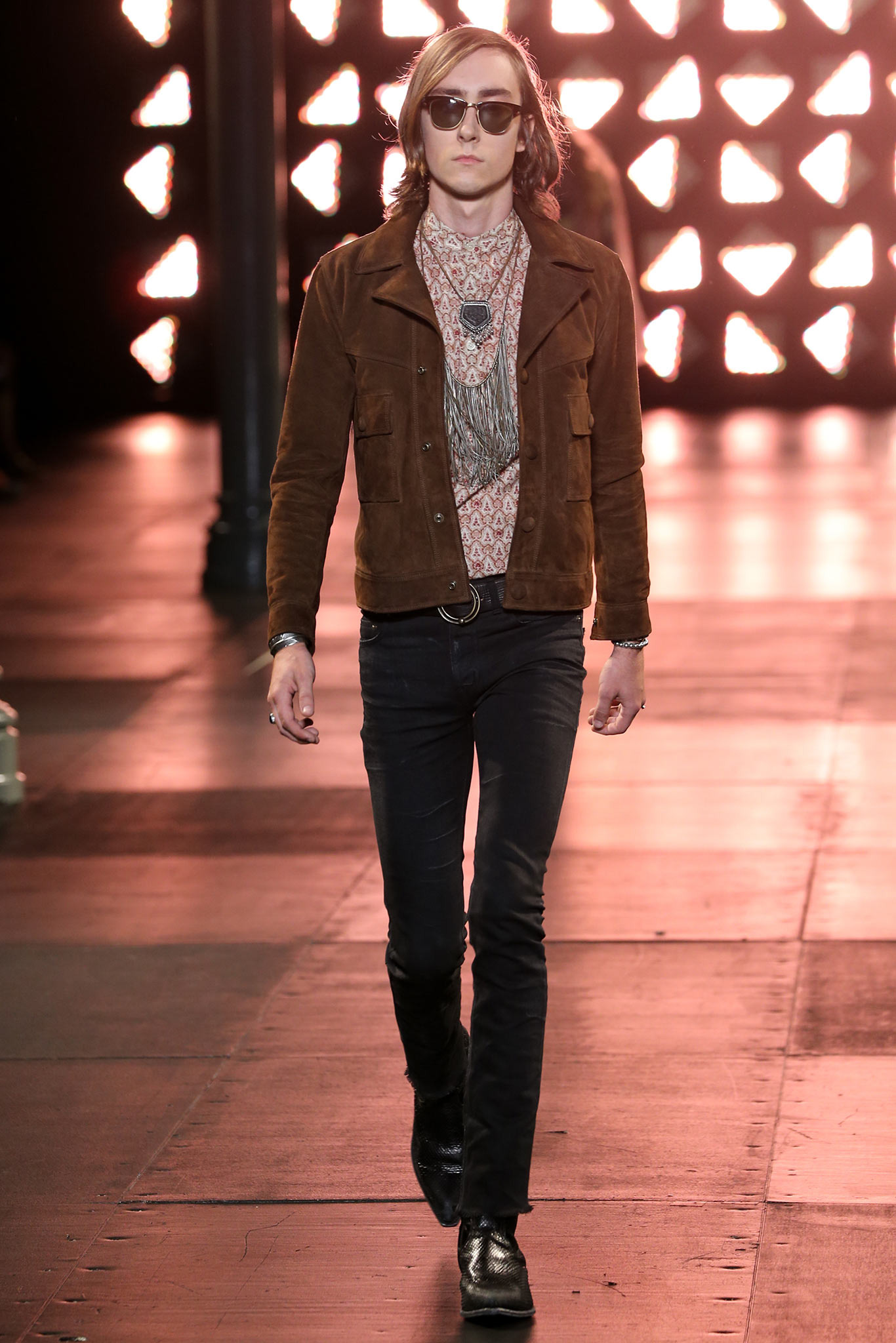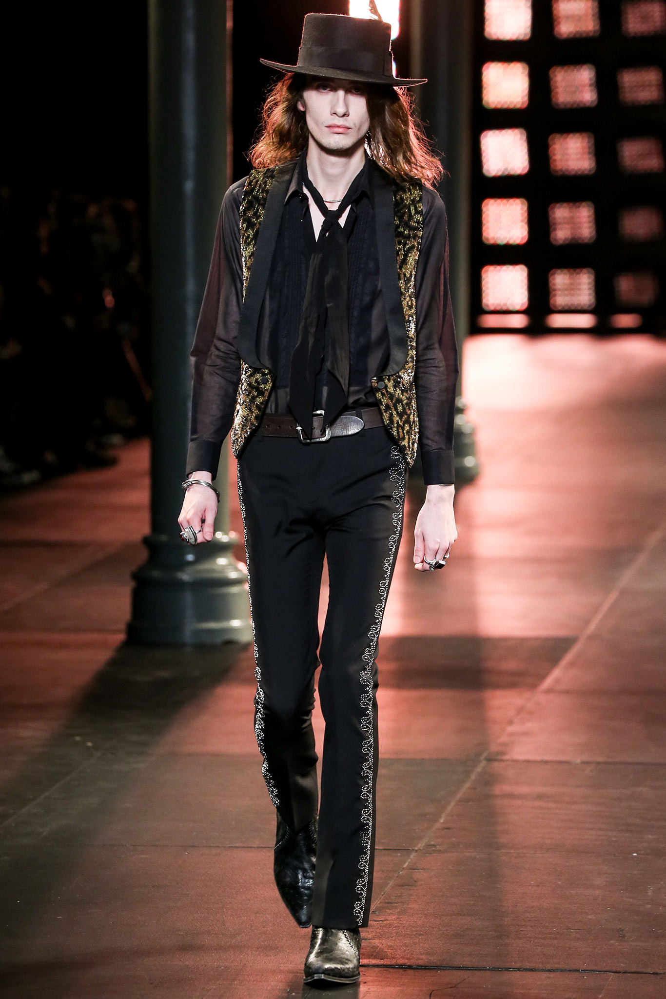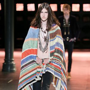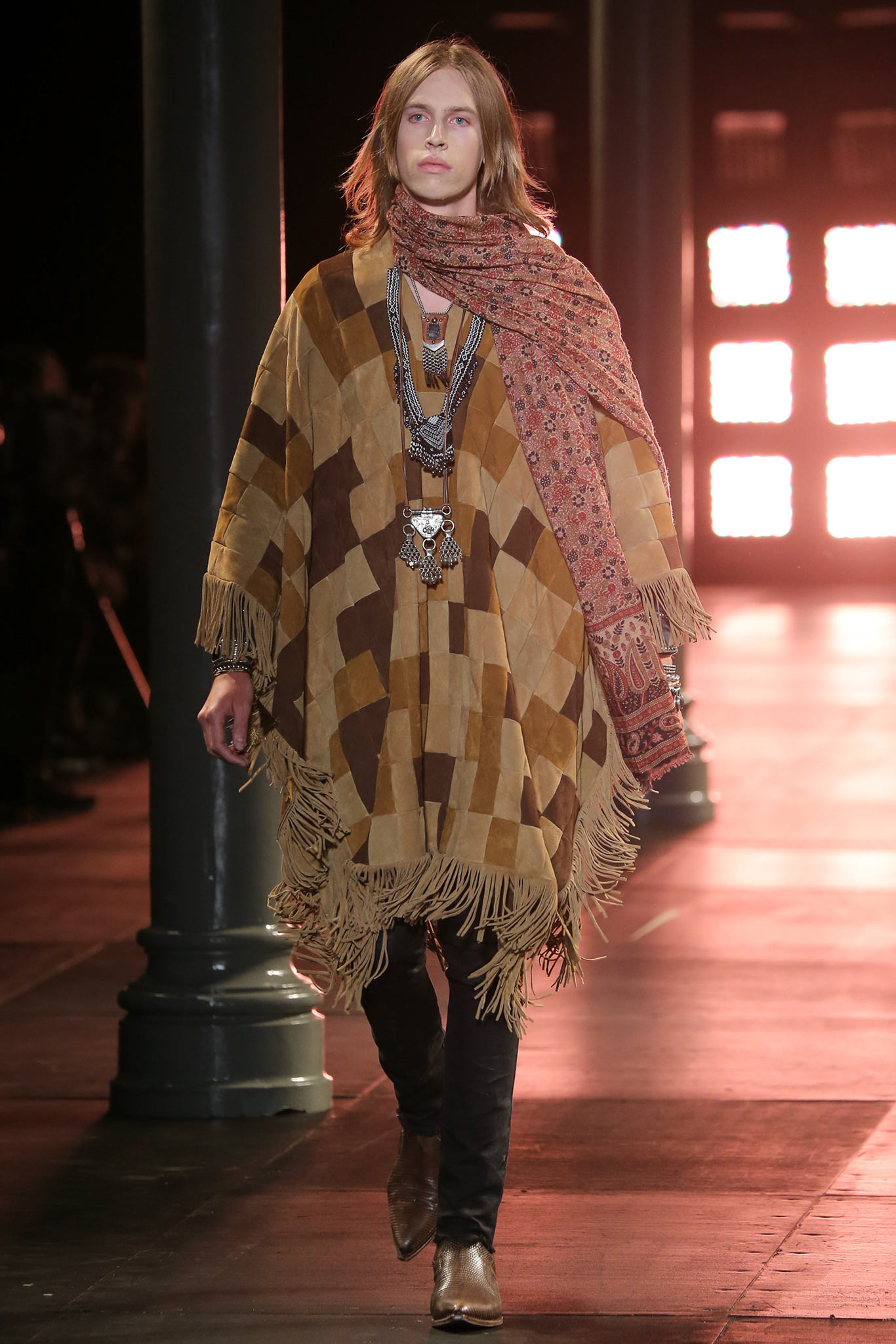 On the seat of every chair for the presentation of Saint Laurent's menswear collection for the Spring/Summer 2015 season was a card that read "Psych Rock's New Rising" and with that, the tone of the runway was set. With the music from the Mystic Braves opening the show, audiences familiar with creative director Hedi Slimane's earlier shown disco tuxedos and shimmering jackets were met with a different style for this upcoming season; with models adorning striped Mexican ponchos and skinny matador pants embroidered down the side.