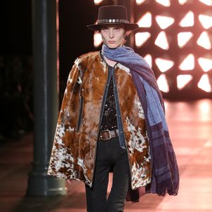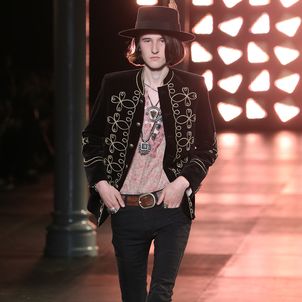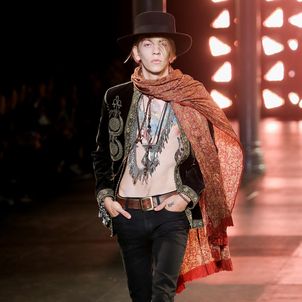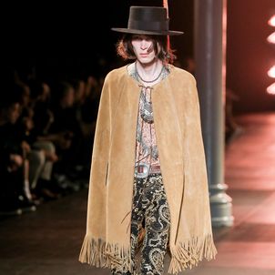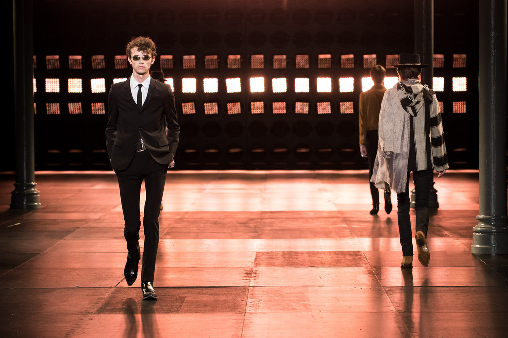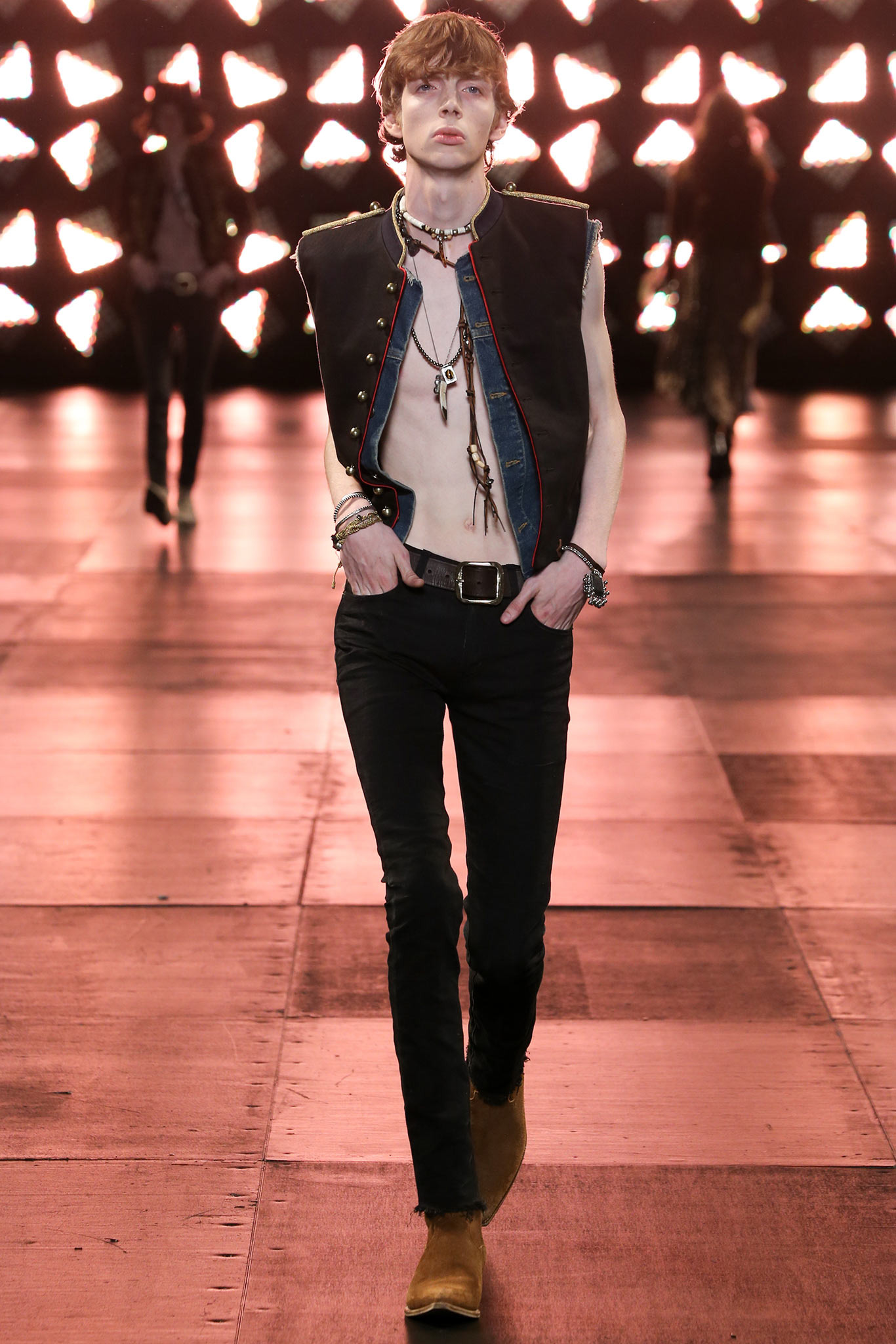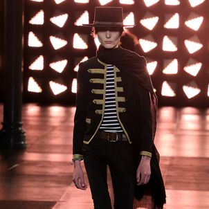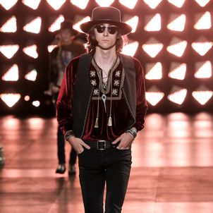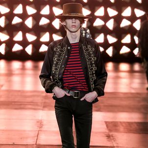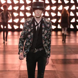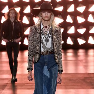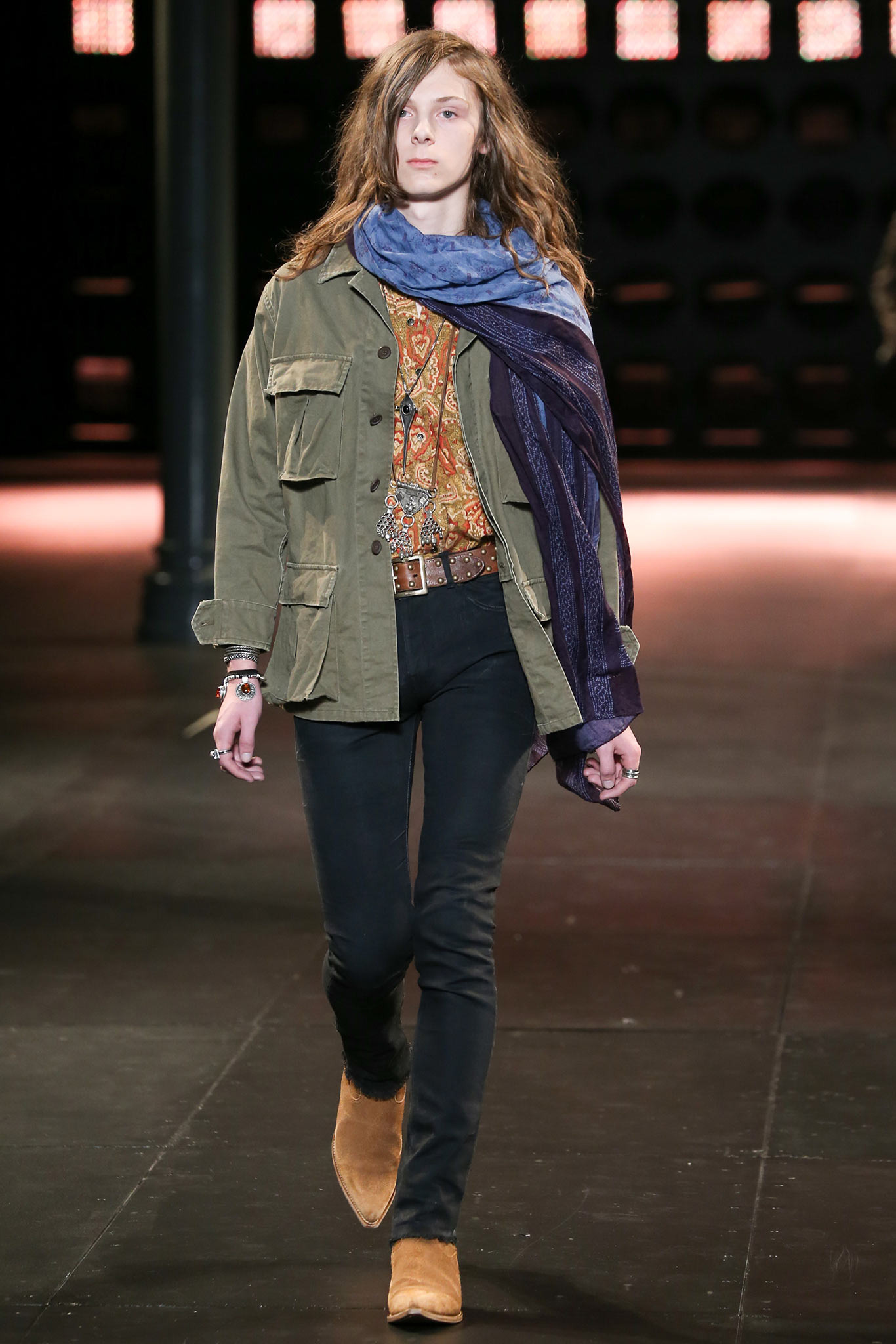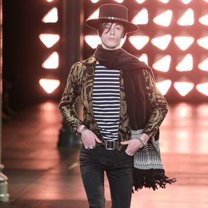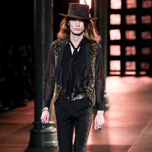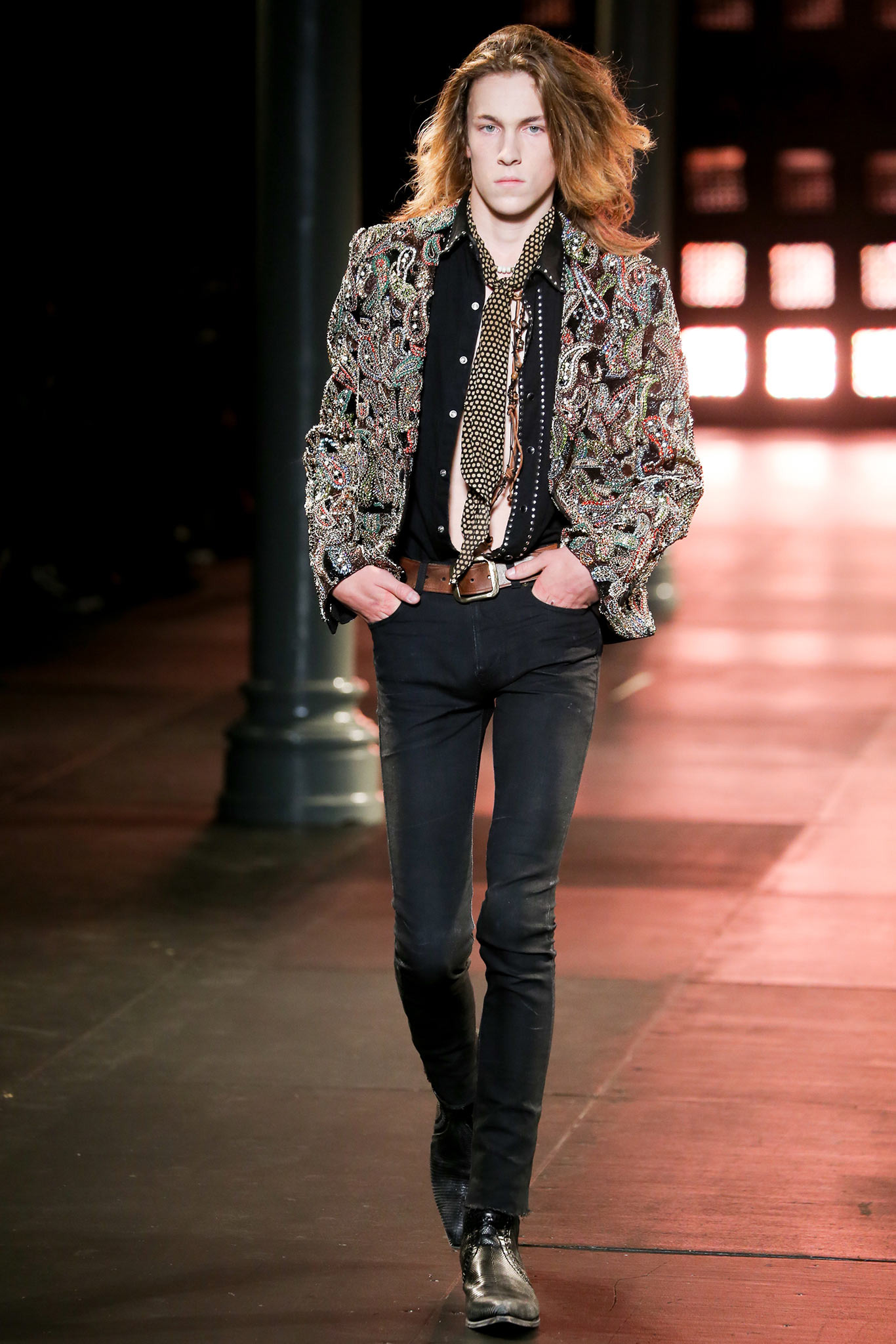 On the seat of every chair for the presentation of Saint Laurent's menswear collection for the Spring/Summer 2015 season was a card that read "Psych Rock's New Rising" and with that, the tone of the runway was set. With the music from the Mystic Braves opening the show, audiences familiar with creative director Hedi Slimane's earlier shown disco tuxedos and shimmering jackets were met with a different style for this upcoming season; with models adorning striped Mexican ponchos and skinny matador pants embroidered down the side.