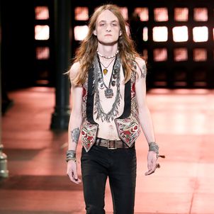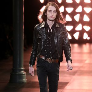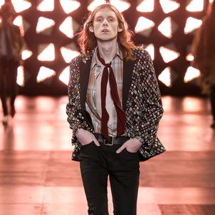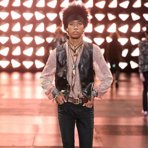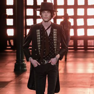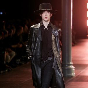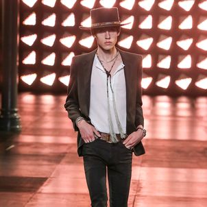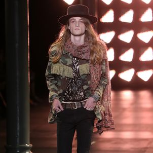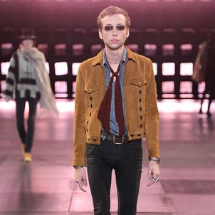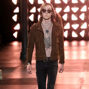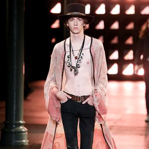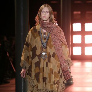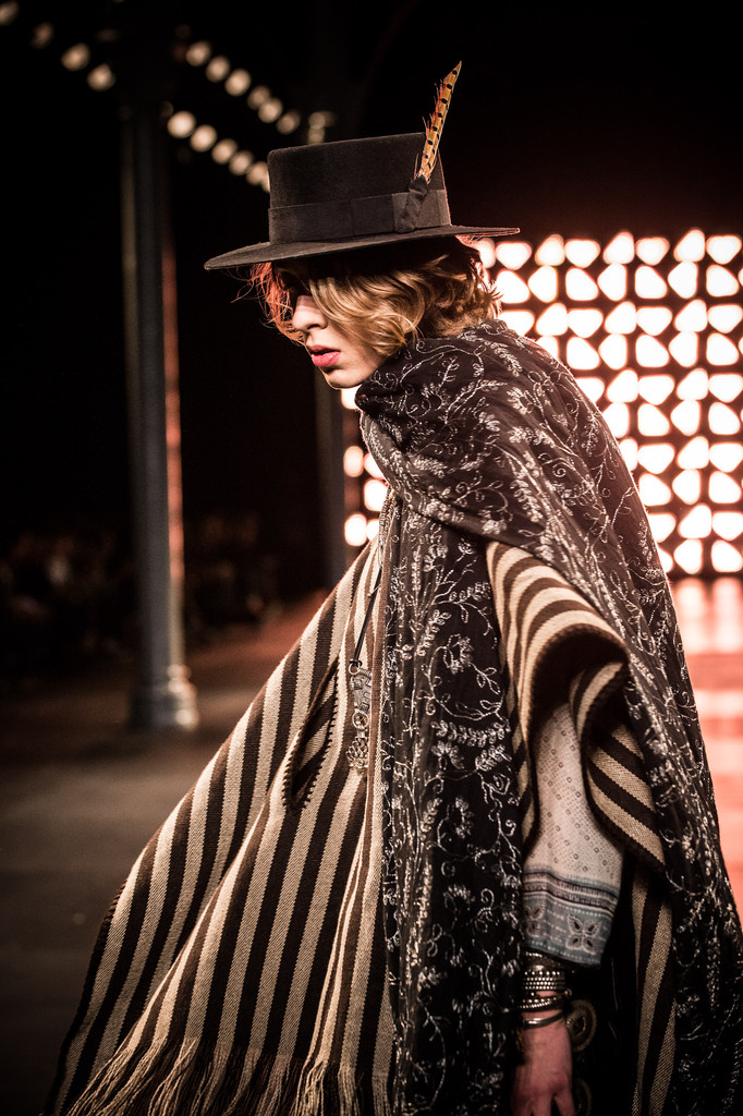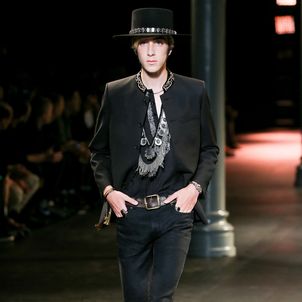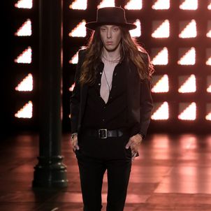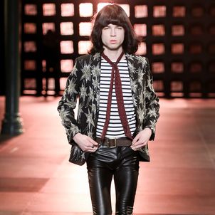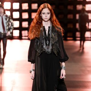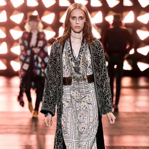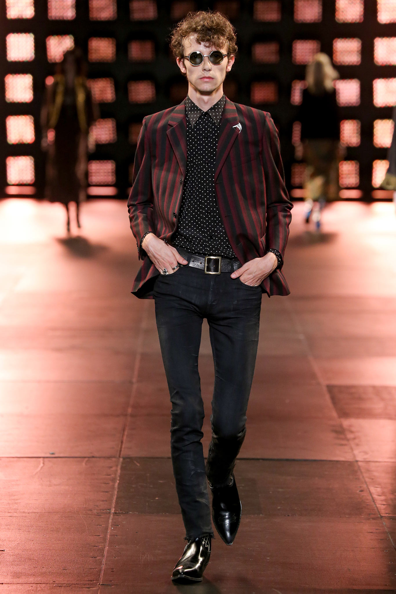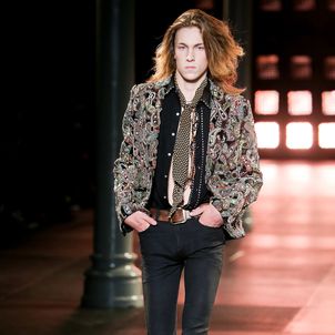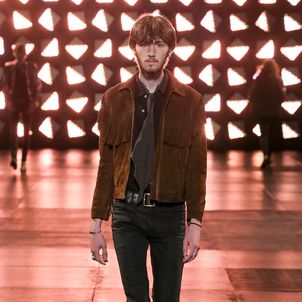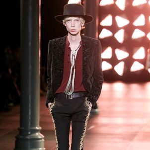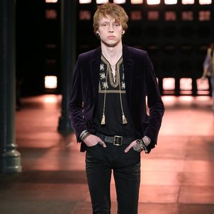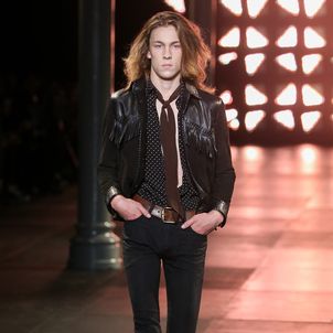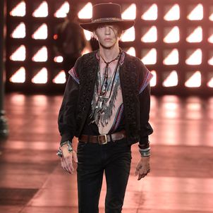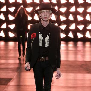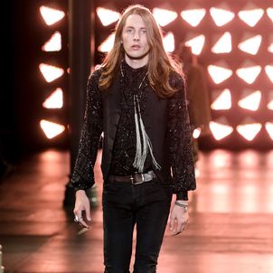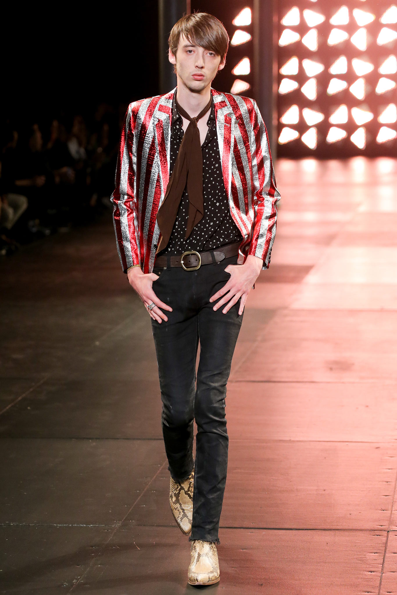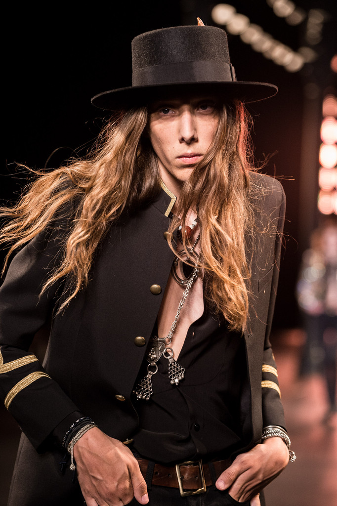 On the seat of every chair for the presentation of Saint Laurent's menswear collection for the Spring/Summer 2015 season was a card that read "Psych Rock's New Rising" and with that, the tone of the runway was set. With the music from the Mystic Braves opening the show, audiences familiar with creative director Hedi Slimane's earlier shown disco tuxedos and shimmering jackets were met with a different style for this upcoming season; with models adorning striped Mexican ponchos and skinny matador pants embroidered down the side.