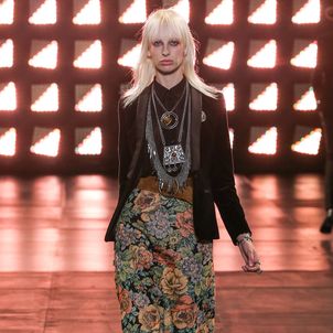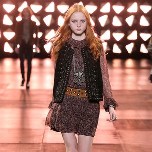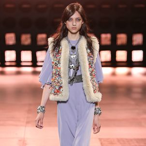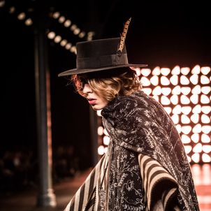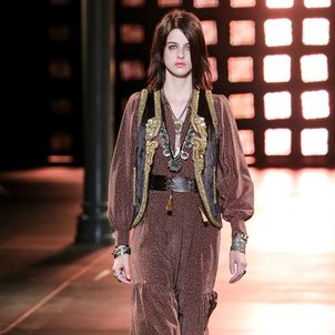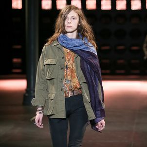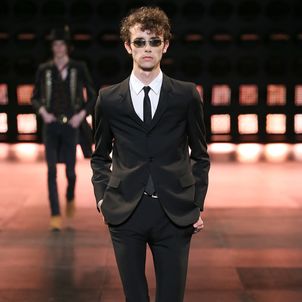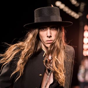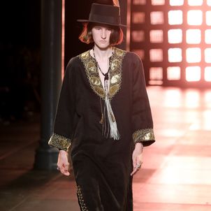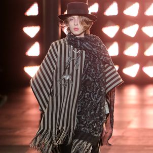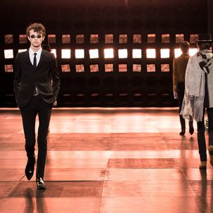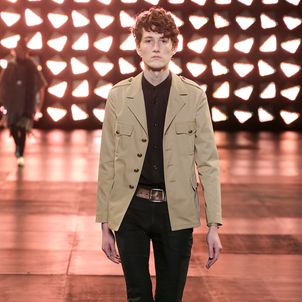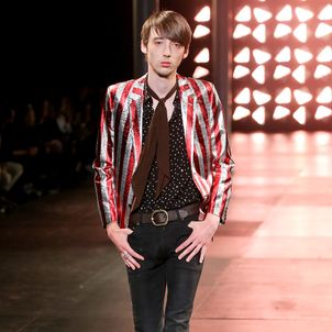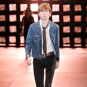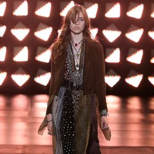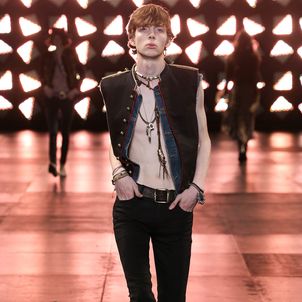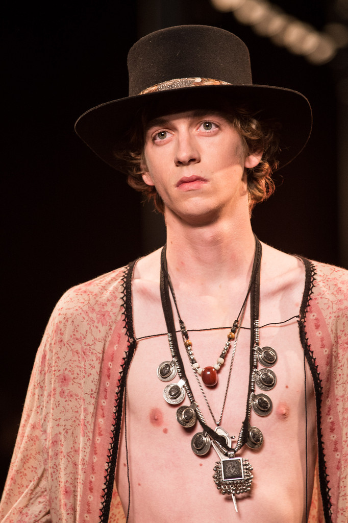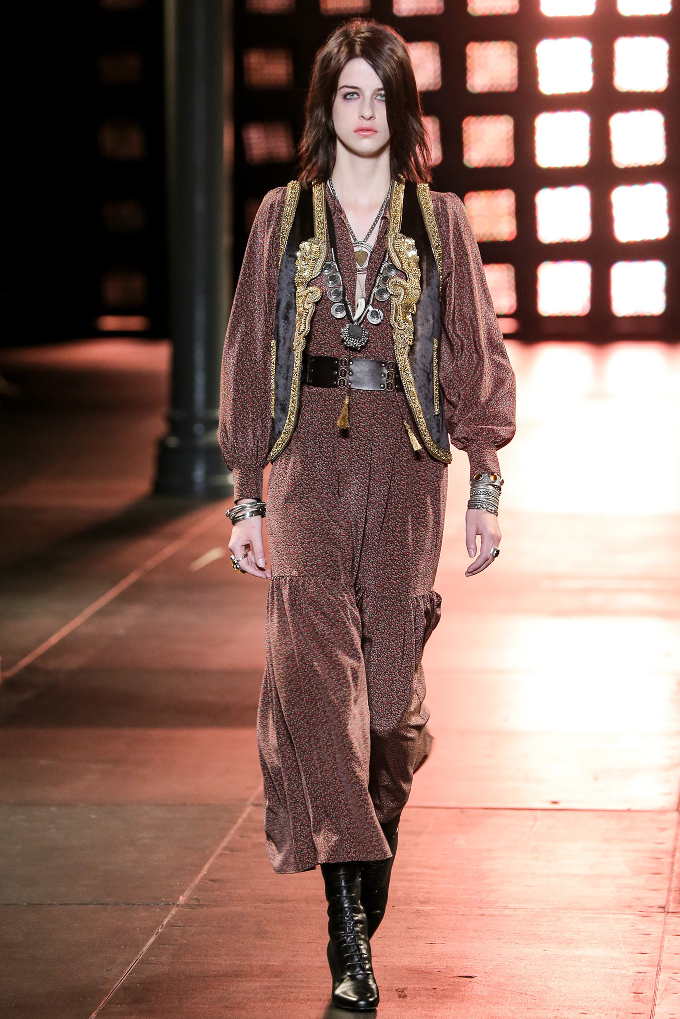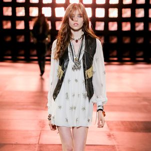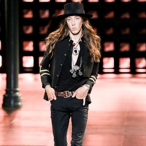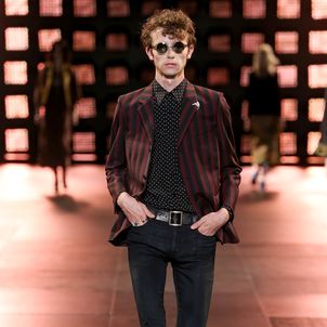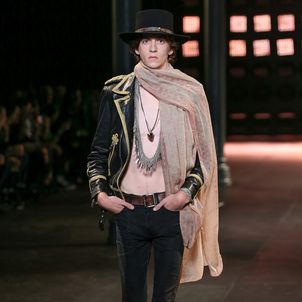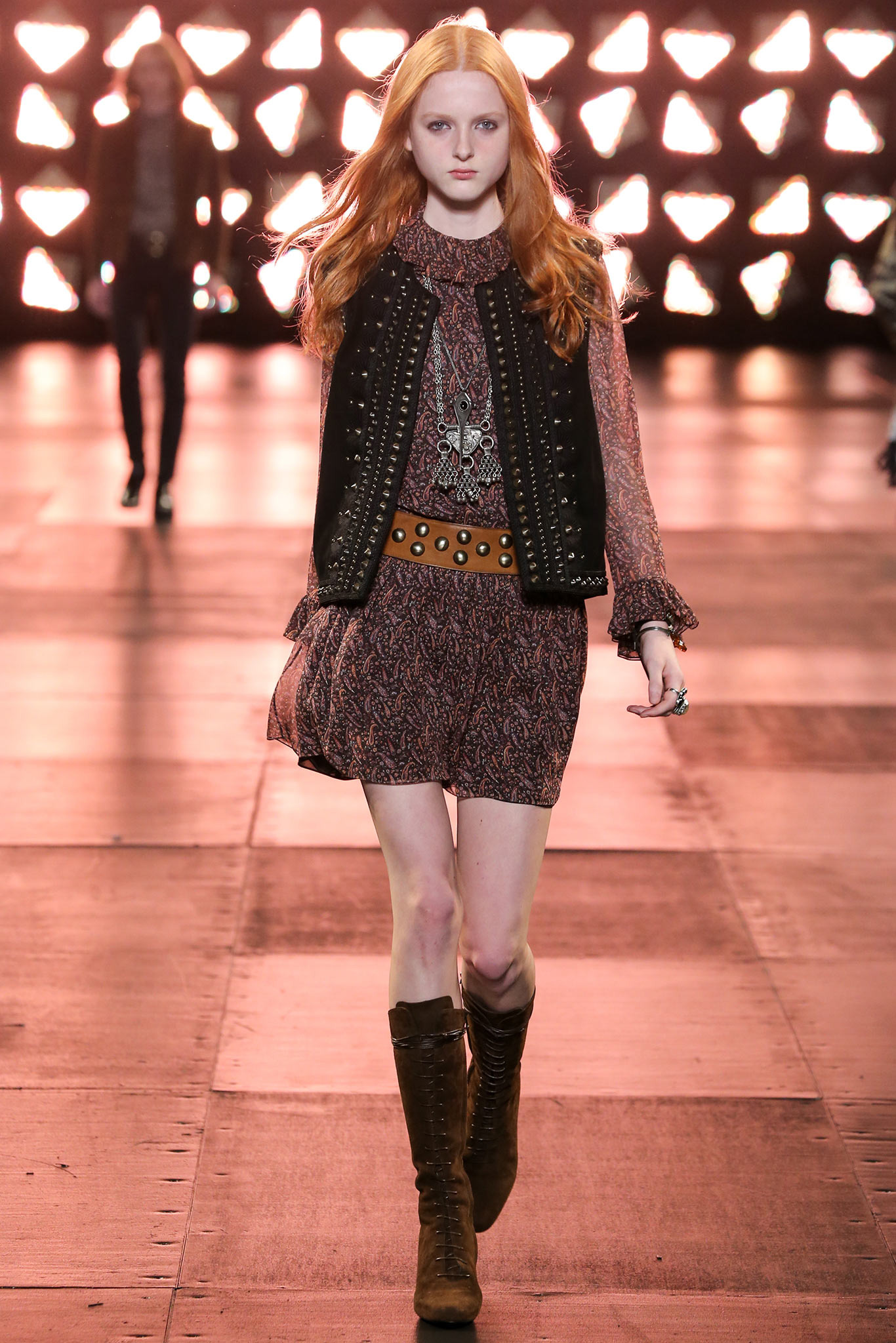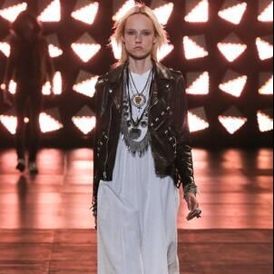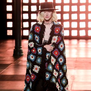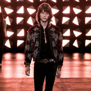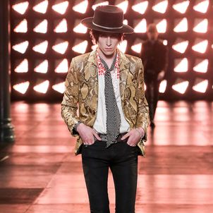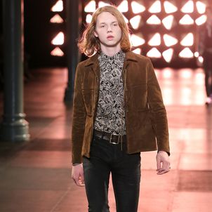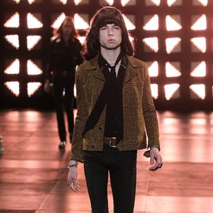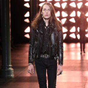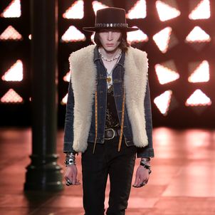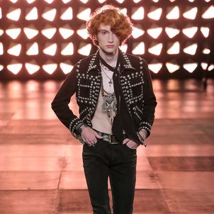 On the seat of every chair for the presentation of Saint Laurent's menswear collection for the Spring/Summer 2015 season was a card that read "Psych Rock's New Rising" and with that, the tone of the runway was set. With the music from the Mystic Braves opening the show, audiences familiar with creative director Hedi Slimane's earlier shown disco tuxedos and shimmering jackets were met with a different style for this upcoming season; with models adorning striped Mexican ponchos and skinny matador pants embroidered down the side.