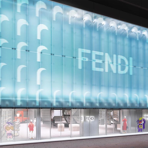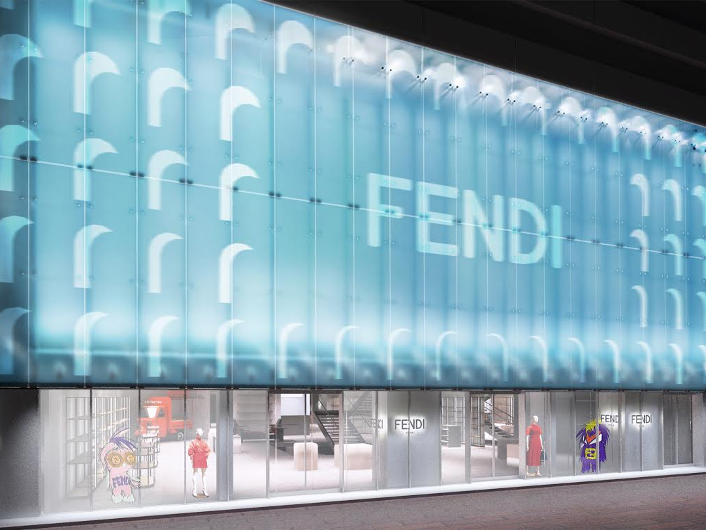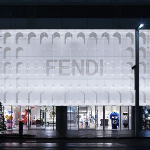The store concept is uniquely inspired by the Palazzo della Civiltà Italiana (Palace of Italian civilisation), a historic rationalist-style building located in Rome's modern EUR district, where Fendi has recently established its headquarters. The Tokyo store's façade features a blue neon rendering of the Rome building's famous arches.