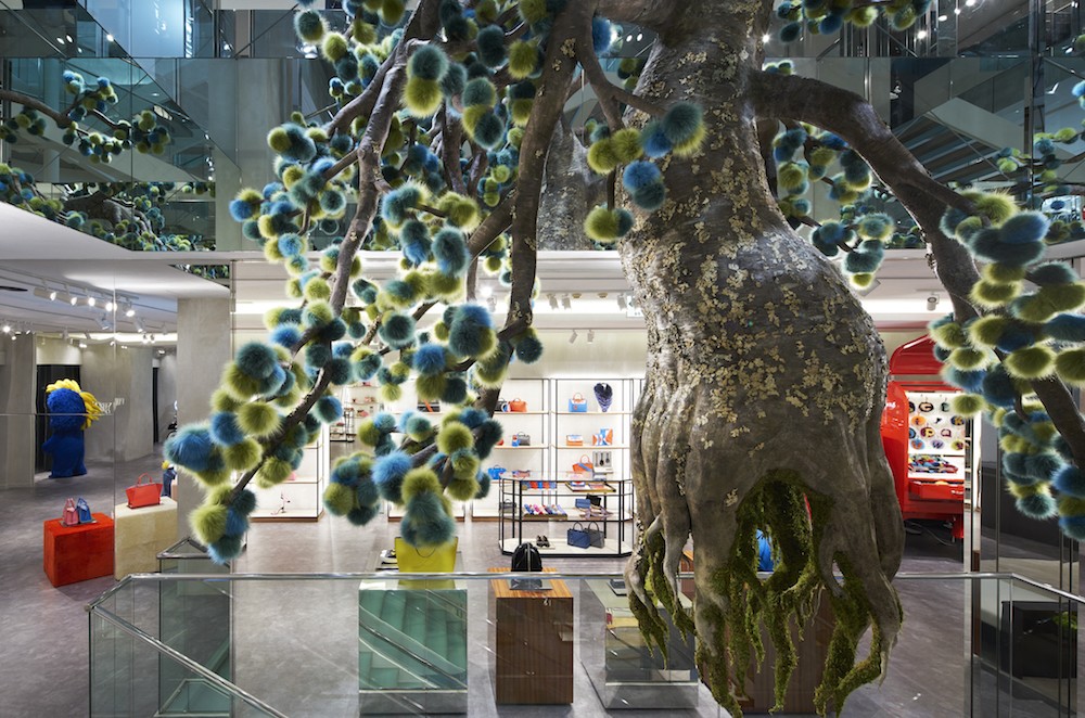 The mood inside is "like that of a theme park" and includes a giant version of the Karlito doll, conceived by Fendi's Creative Director Karl Lagerfeld, next to the famous Italian three-wheel 'Ape' scooters. A pop-up art piece titled 'Fur Tree' has also been created by Japanese artist Makoto Azuma, who specialises in unusual floral compositions, for the occasion.