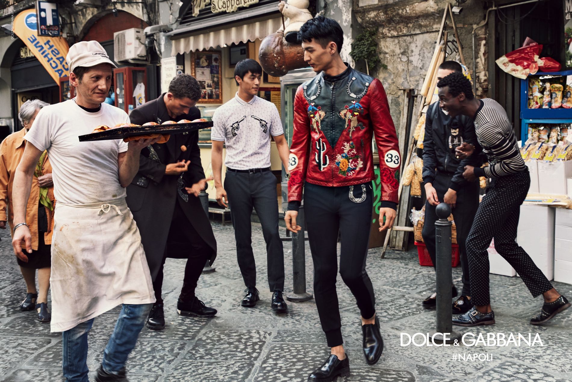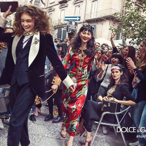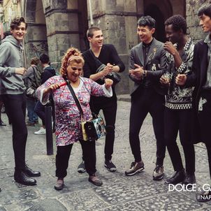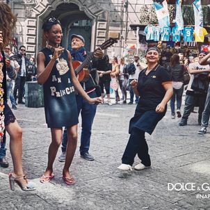 The cobbled streets of the Spaccanapoli neighbourhood and the city’s famous Via dei Tribunali, San Gregorio Armeno, piazza San Domenico Maggiore and via San Paolo provide the setting for the images, which see designer-clad models dancing around busking musicians and laughing with an elderly woman at the market.