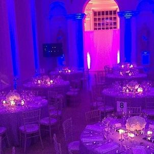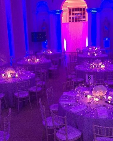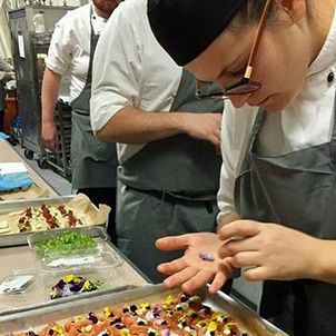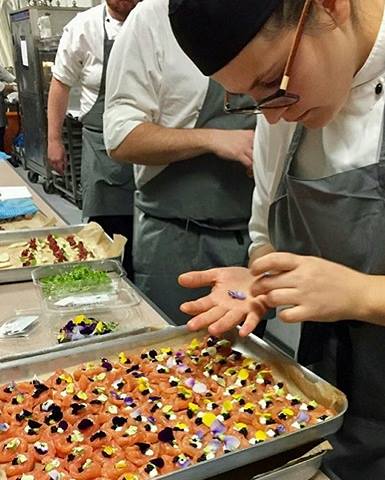 Guests were served canapés followed by a sit-down dinner of butter-poached chicken breast, potato terrine, baby leeks wild mushrooms and salsify followed by Apple tart tartin, pat and black olive crumble, Szechuan pepper ice cream and caramel gel.