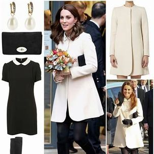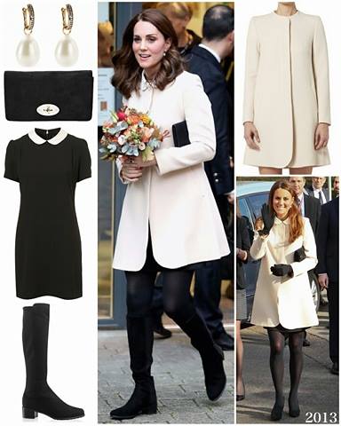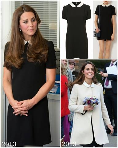 •Just like last time, Kate paired the coat with her Topshop's 'Contrast Collar Dress' featuring a contrasting Peter Pan collar that she wears over the coat. Kate's dress sits much lower than the one pictured on the model. This dress is no longer available but last sold for £54/$71.
