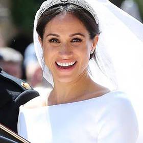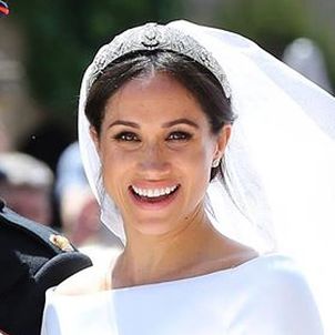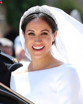 The veil is held in place by Queen Mary's diamond bandeau tiara, lent to Ms. Markle by The Queen. The diamond bandeau is English and was made in 1932, with the entre brooch dating from 1893.