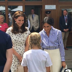 Update: Kate also wore Ray-Ban’s ‘New Rubber Youngster Sunglasses’. As for The Duchess of Sussex, she wore a blue-and-white boxy, striped blouse by Ralph Lauren which she wore unbuttoned and relaxed. She paired it with white Ralph Lauren wide-leg trousers and a Maison Michel ‘Virginie’ hat. Meghan carried the Altuzarra 'Ghianda' Saddle Bag and wore ILLESTEVA ‘Leonard’ sunglasses.