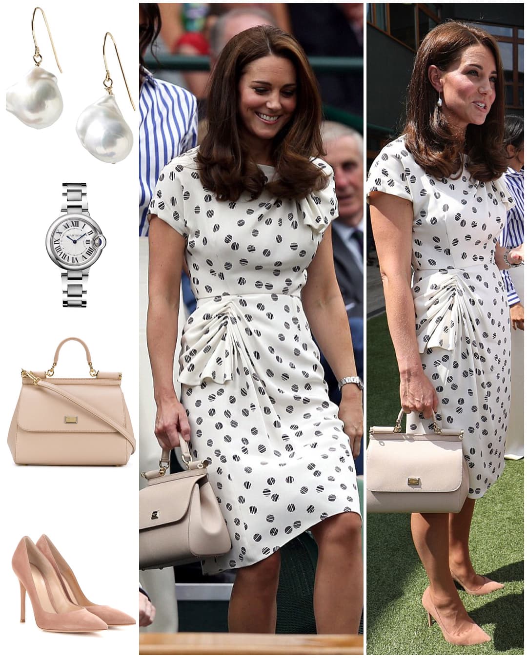 The Duchess of Cambridge chose to go with the tennis whites theme once again, picking this polka dot summer dress by one of her favourite labels, Jenny Packham. It features a a ruched-effect at the waist, ruffle detail at the neckline, short sleeves and a tennis ball-like pattern. Packham is known for creating bespoke items for Kate that pay subtle homage to the specific event she is attending.