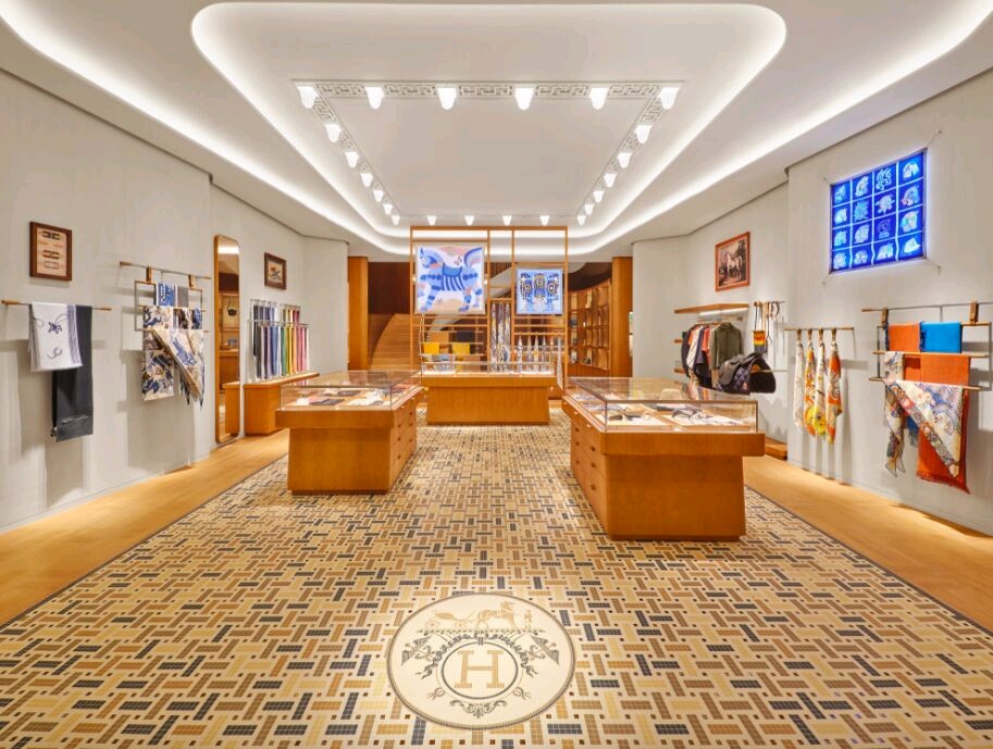 The spaces dedicated to each métier are smoothly divided, beginning with the women and men’s silk at the entrance on the lower level, followed by the men’s ready-to-wear, the perfume and beauty, and the fashion jewellery. At the heart of the store, benefitting from natural light, the equestrian and leather collections lead to the staircase to the upper level, where visitors will discover the women’s ready-to-wear, as well as objects for the home, jewellery, and watches.