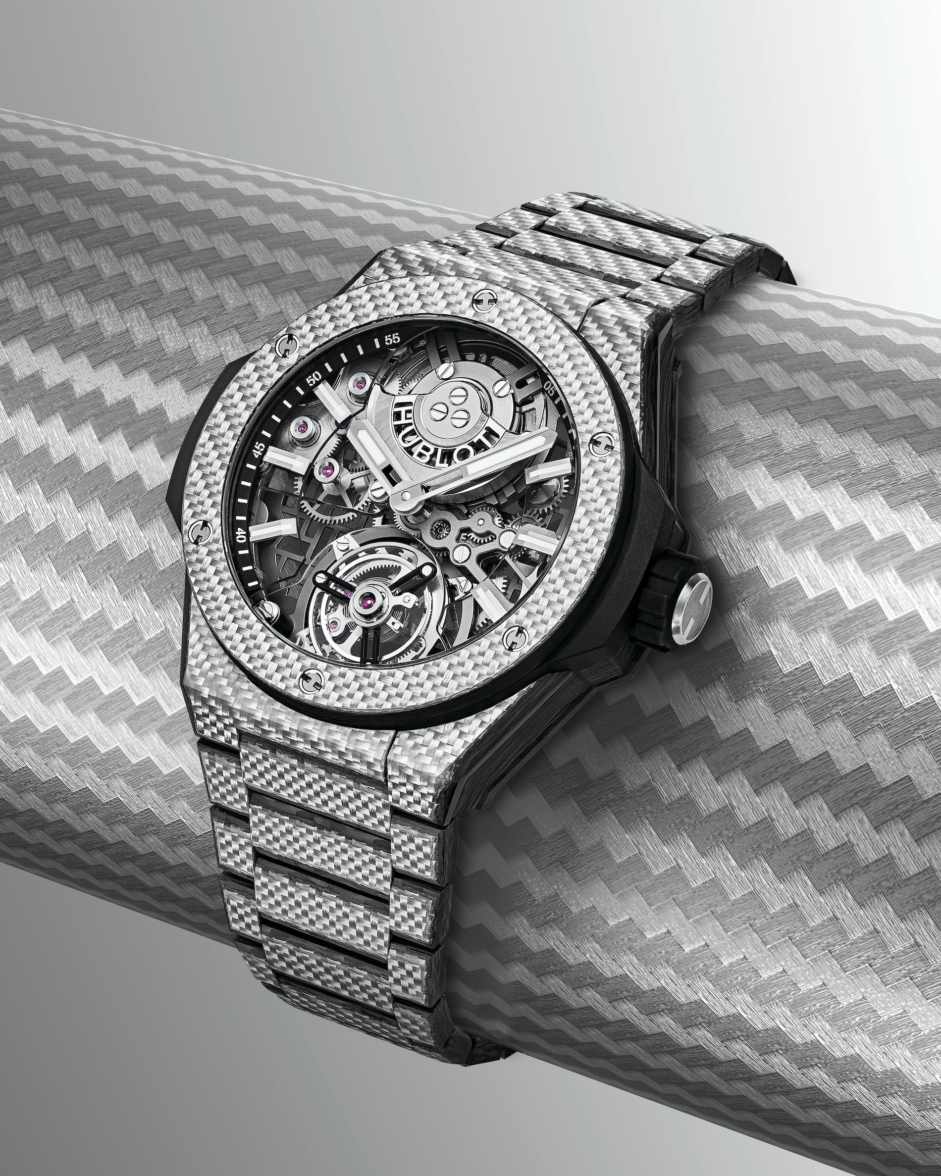 The Big Bang Integrated Tourbillon Full Carbon boasts an exclusive openwork back plate, with a permeable structure that allows light to penetrate to the heart of the movement, strengthening the cohesion between aesthetics and technique, while also recalling the interlaced nature of the materials and the exclusivity of the piece — the only one in the world with a monobloc component of this kind.