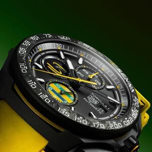 The first iteration, fueled by an automatic movement, champions Senna’s spirited identity. It features a streamlined date display at three o'clock and a seconds counter at nine, stamped with the unforgettable signature yellow “S” logo. The second version offers a different mechanical rhythm with a running seconds counter at three and a 30-minute counter at nine.