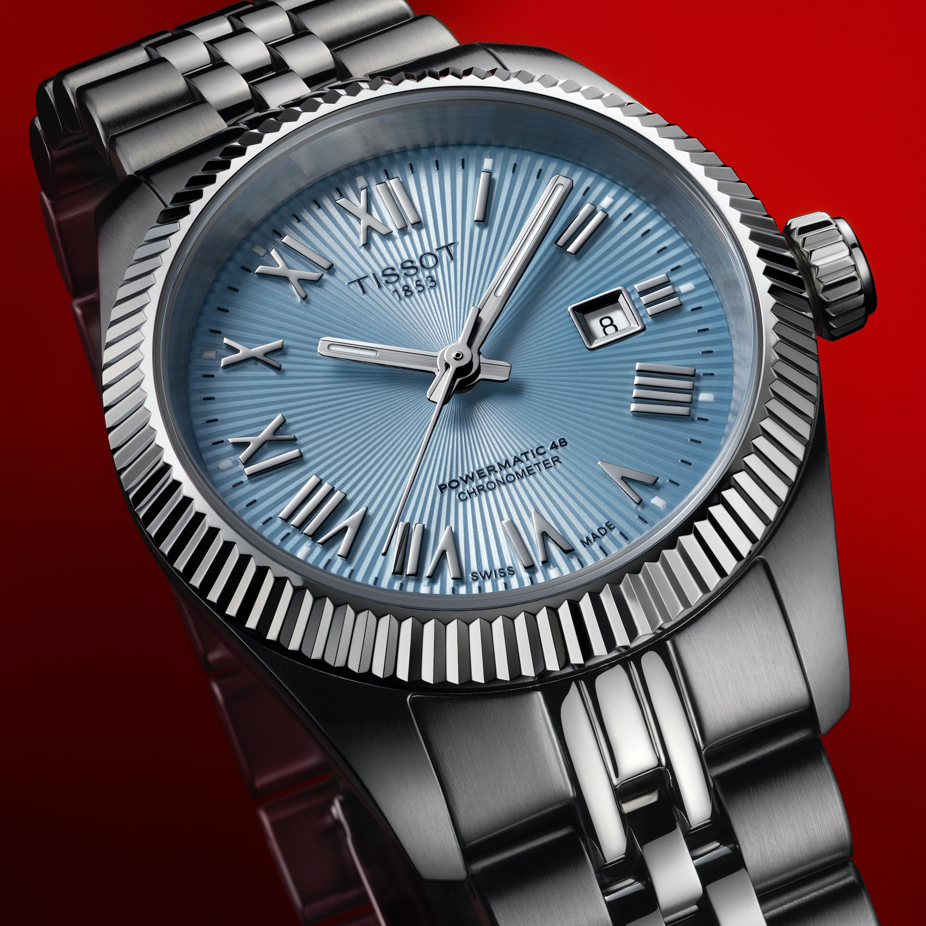 The timepiece illustrates that some things only get better with time. Its design has evolved over the years to carry the marks of experience while serving as a true testament to the savoir-faire of Tissot. A fluted bezel frames the dial as a tribute to tradition while a guilloché sunburst finish adds depth and texture. The composition is completed by classic Roman numerals for a timeless touch and a five-link interchangeable bracelet that adds sophistication to the design.