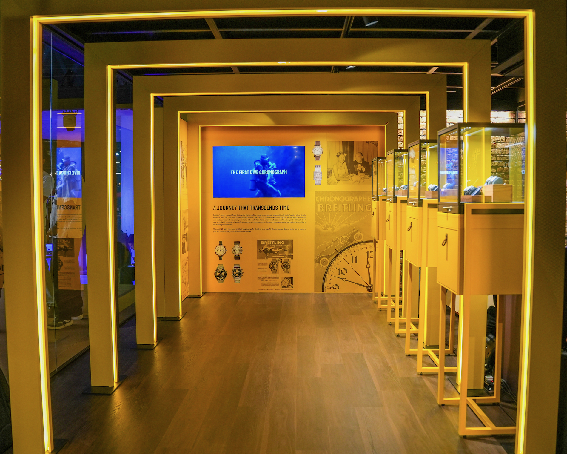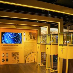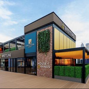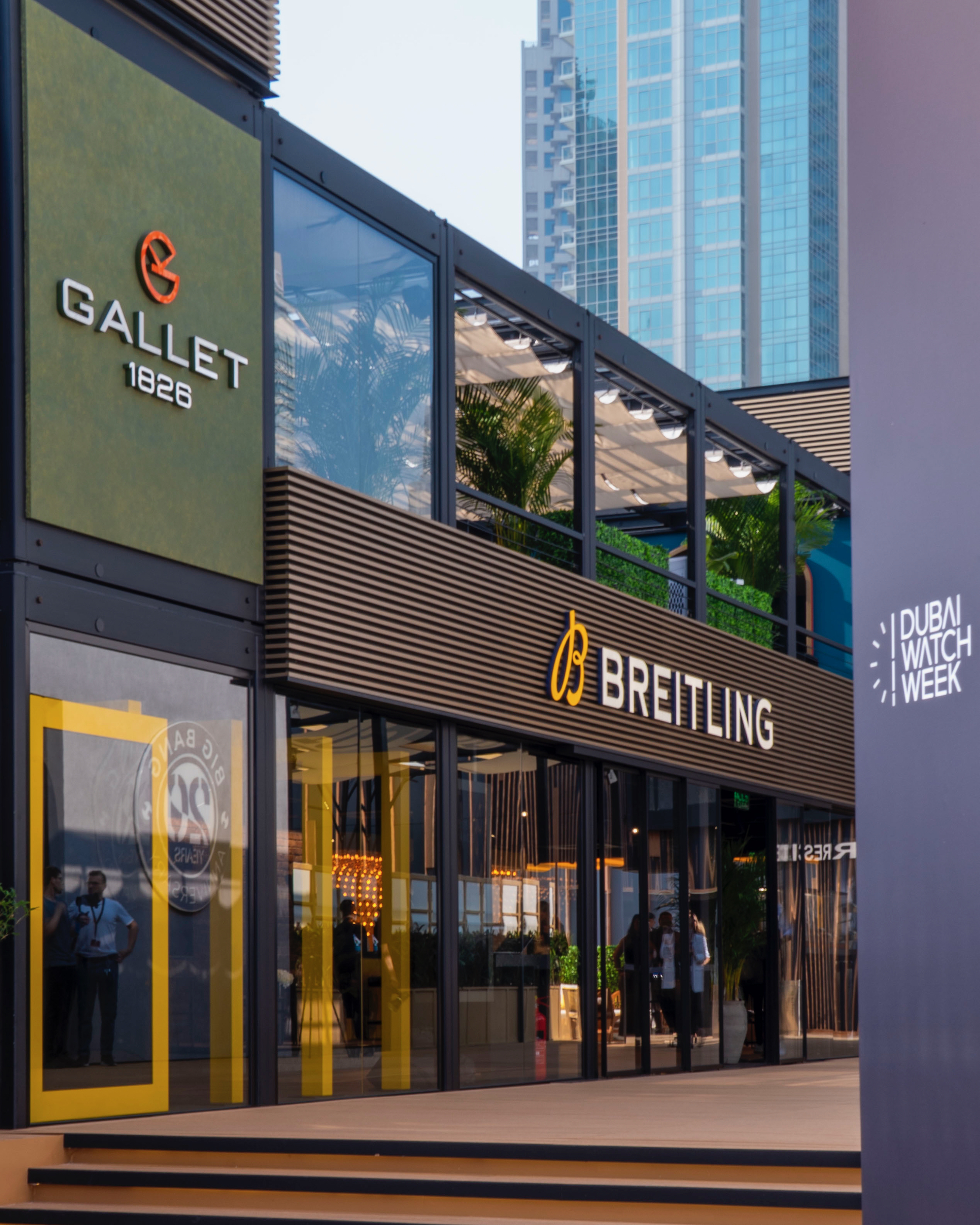 Breitling takes center stage with its signature yellow accents adding a vibrant pop of color to the facade. The Swiss watchmaker has created a welcoming atmosphere that invites guests to step out of the sun and into a world of precision luxury. But they are not alone in this horological haven. The pavilion also proudly displays the banner of Universal Genève which signals a thrilling new chapter for the heritage brand under the same roof. Even the historic name of Gallet makes an appearance to complete a trinity of watchmaking excellence.