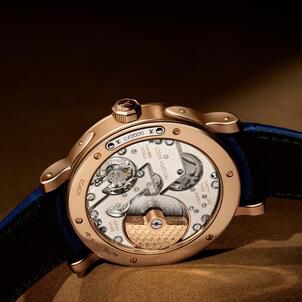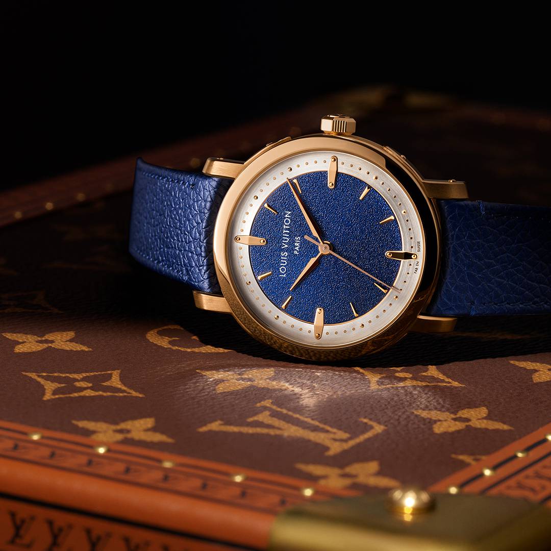 Bathed in the warm, sunset glow of rose gold, the watch features a blue-grained dial that serves as a tactile tribute to the House’s emblematic canvas. To run a finger over the surface of a classic trunk is to understand the soul of this design. It is a texture that speaks of heritage and the rugged elegance of the open road.