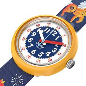 The design of the Flik Flak Year of the Horse is a visual celebration of equine energy and cultural heritage. Festive horses in shades of red, yellow, and gold gallivant across a midnight blue strap, a color palette intended to inspire courage and a go-getting attitude in young wearers. Traditional elements such as lanterns and temples dot the landscape of the strap, while playful fireworks add a sense of movement and festivity to the overall aesthetic. At the heart of the piece, a bold gold-colored dial provides a striking focal point for the celebratory design.