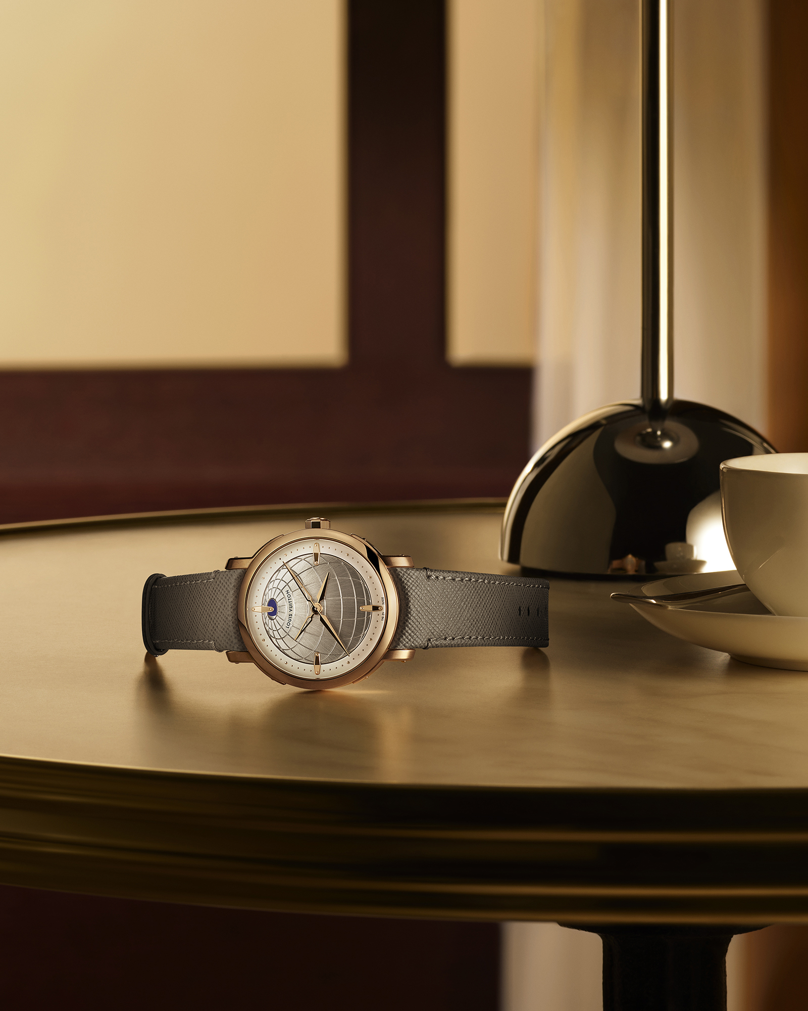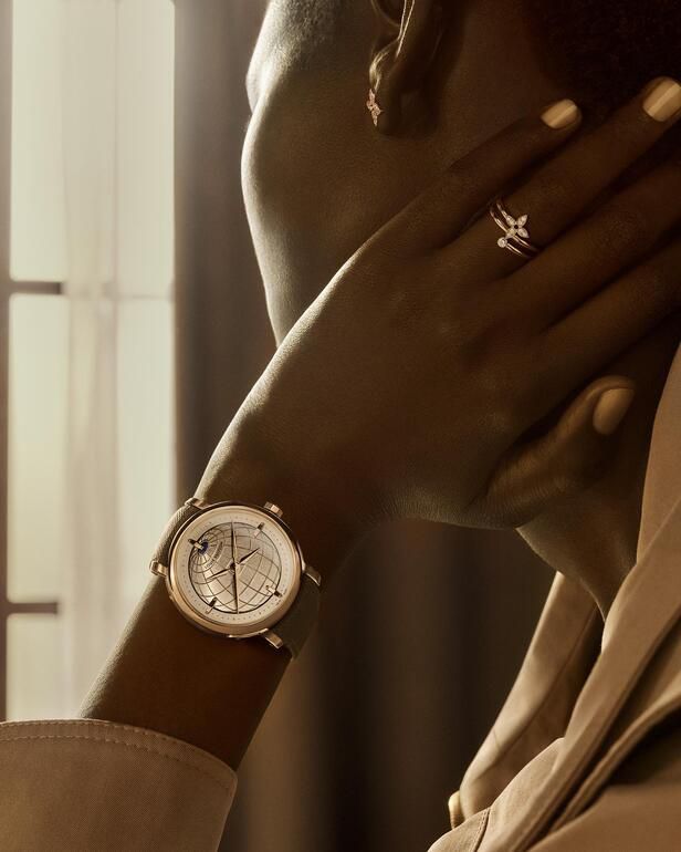 The design is a masterclass in "less is more". Four hands are mounted on a single axis to maintain a clean, architectural dial. When at home, the skeletonized hands can be tucked away, leaving a serene time-only aesthetic. A rose gold edition offers a silvery globe dial engraved with meridians and parallels, while a high jewelry platinum version evokes a starry night through a deep blue aventurine dial. This celestial edition is a glittering tour de force, adorned with over 300 baguette-cut diamonds across the dial, bezel, and case.
