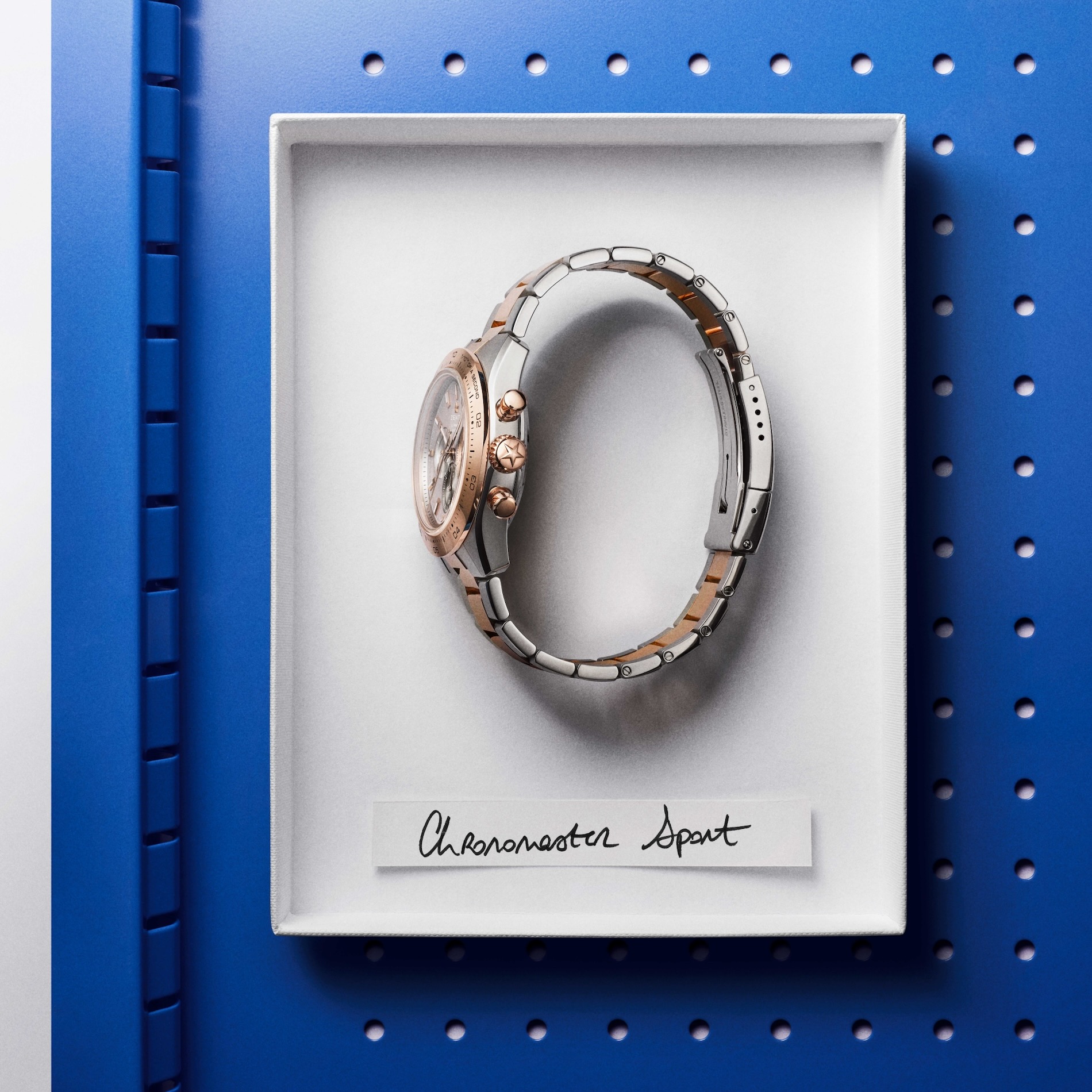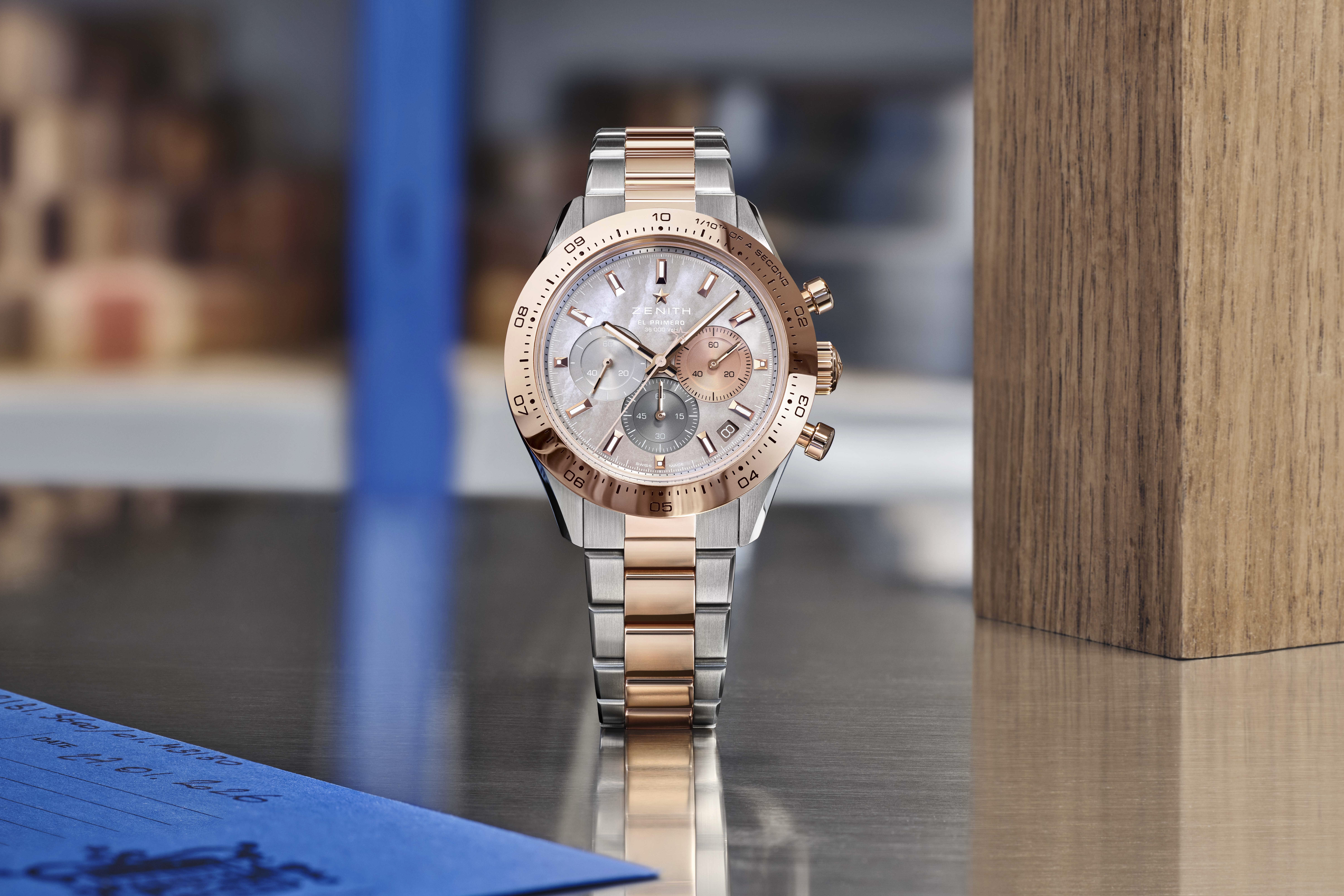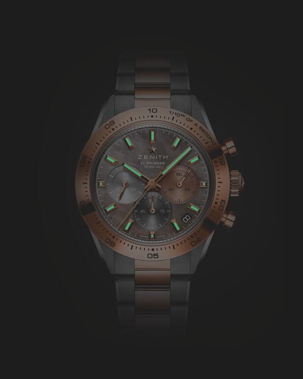 At its core beats the El Primero 3600, a movement that translates high mechanical frequency into visible motion. The central chronograph hand completes a full rotation in just ten seconds, a natural consequence of an architecture designed to measure 1/10th of a second. Visible through the sapphire case back, the movement reveals a column wheel and an openworked rotor engraved with the Zenith star.The integrated steel and rose gold bracelet continues this dialogue of contrast, alternating between brushed and polished surfaces to emphasize its structure. For those seeking further adaptability, an additional black rubber strap with a folding clasp is included.