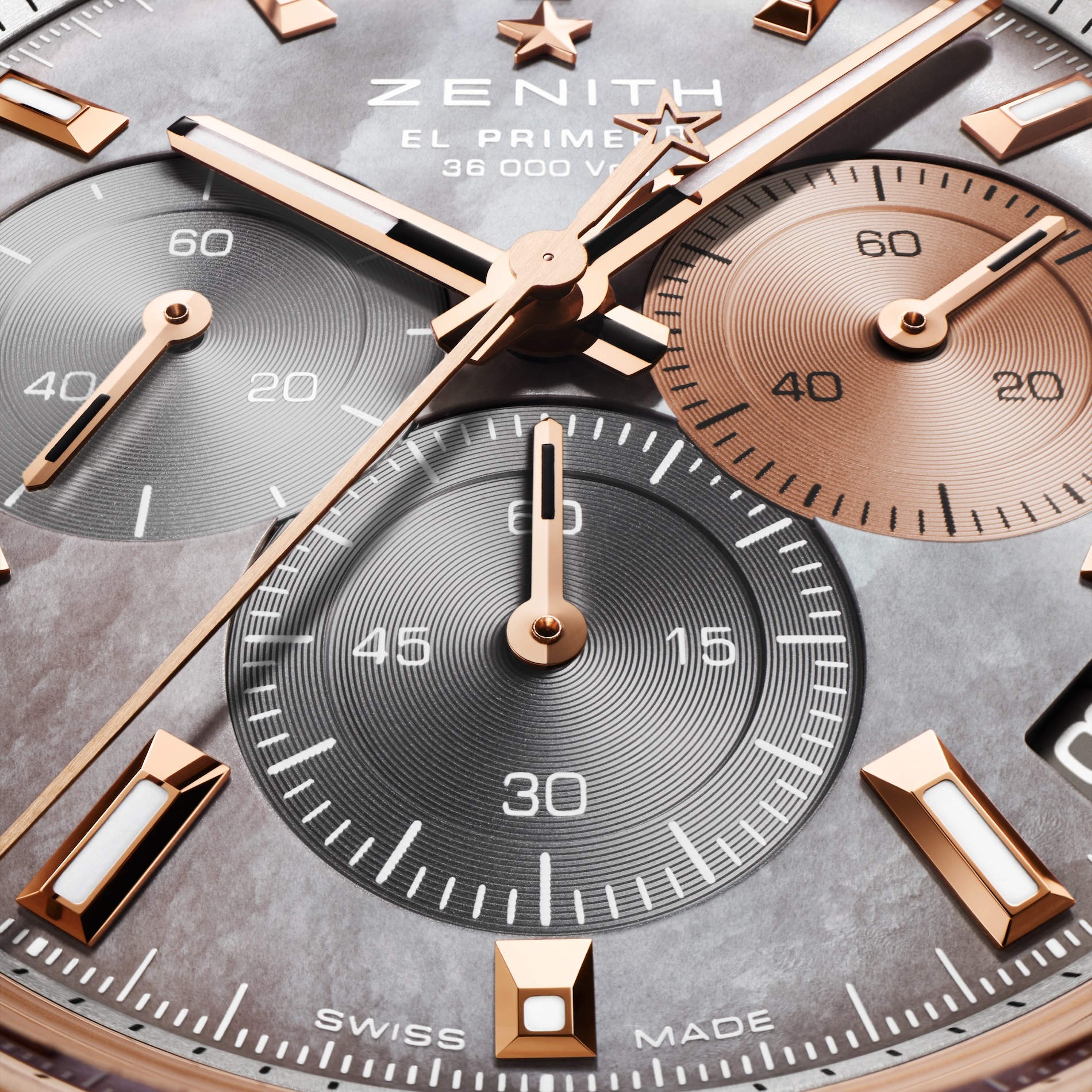 Beneath the sapphire crystal, a mother-of-pearl dial reveals a controlled luminosity that transforms subtly throughout the day as light moves across its surface. The signature 3-6-9 overlapping counters remain intact, serving as a direct lineage to the original El Primero movement. Gold-plated faceted hands and applied indexes ensure that clarity and precision are maintained in all conditions.