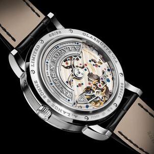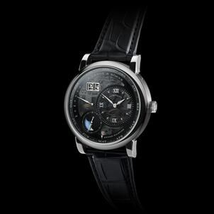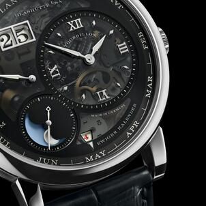 One cannot discuss this A. Lange & Söhne creation without mentioning the premiere of the first luminous moon-phase display with an integrated day/night indication. A celestial disc rotates once every 24 hours, acting as a backdrop for the lunar orbit. During the daylight hours, one sees a clear sky, but at night, the dial reveals a dark firmament "studded with a multitude of luminous stars". It is a complication so precise that it deviates from the true position of the moon by only one day after 122.6 years.