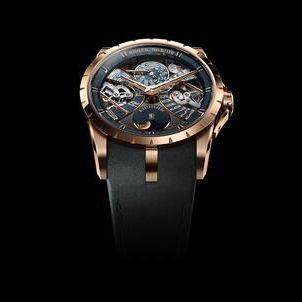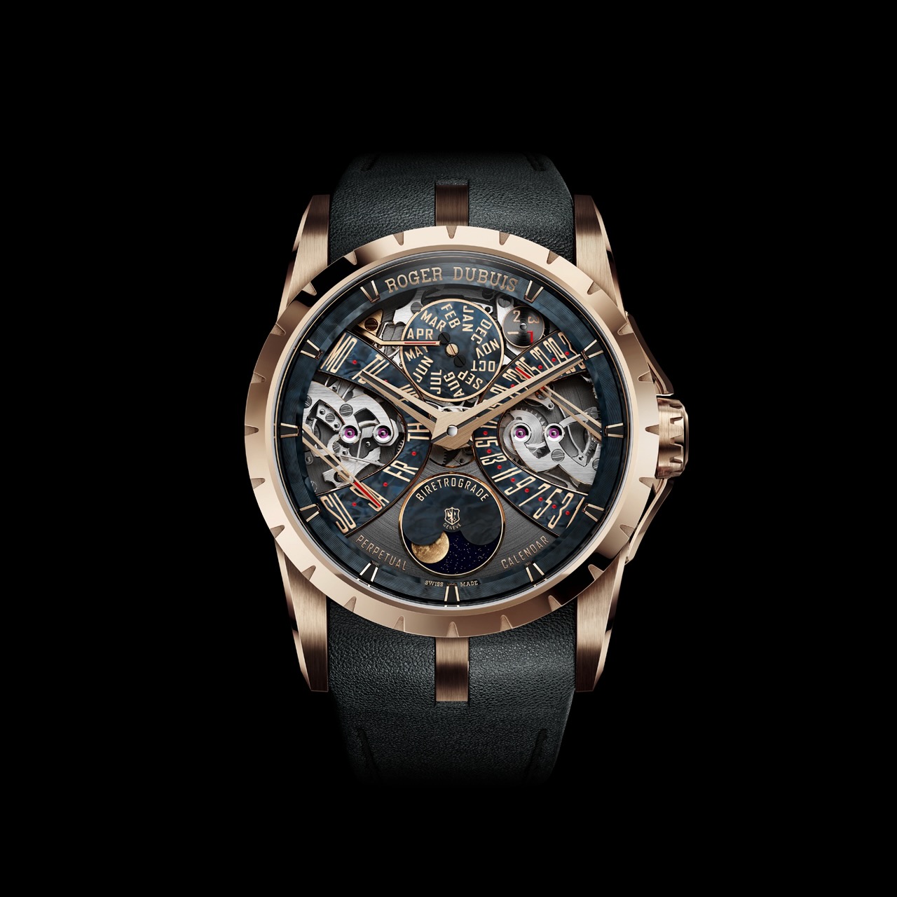 Inside the 18K pink gold case, the new RD850 Calibre represents an upgraded generation of movement. Comprised of 435 components and offering 60 hours of power reserve, this self-winding engine was developed and crafted entirely in-house at the Roger Dubuis manufacture in Geneva. A key functional improvement is the addition of a month corrector, which allows the month indication to be manually set with one simple adjustment, making regulation much faster and easier.