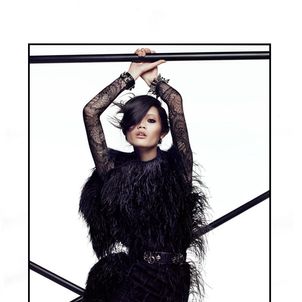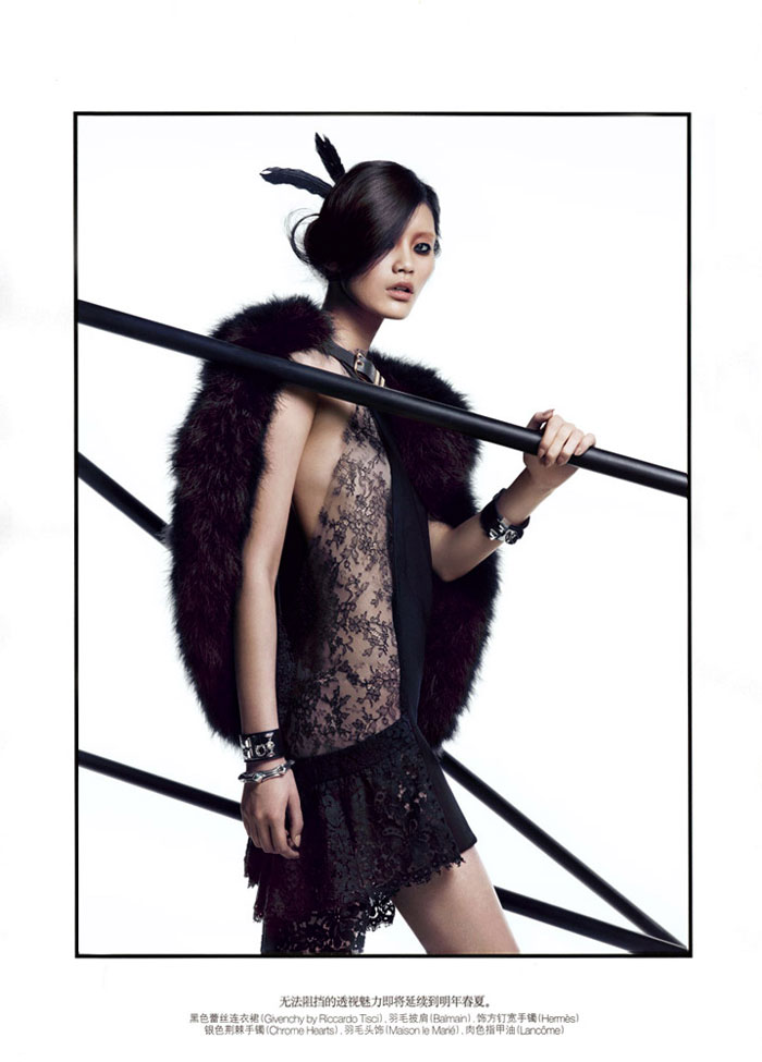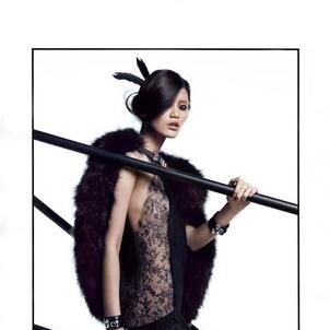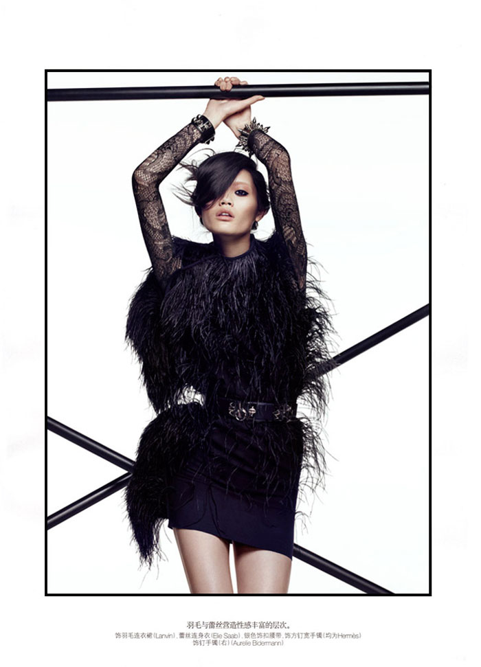 Photographer Lachlan Bailey shoots model Ming Xi in a variety of cool looks in black! Styled by Melanie Huynh, Ming is clothed in full splendor of feather, lace and leather in the fashion spread entitled "Flying High".
