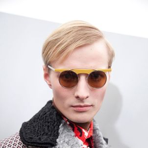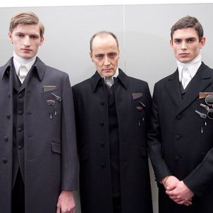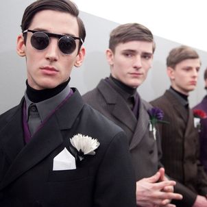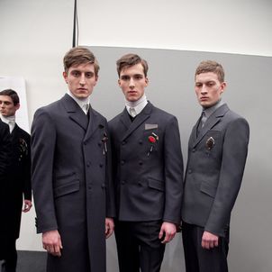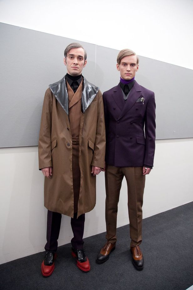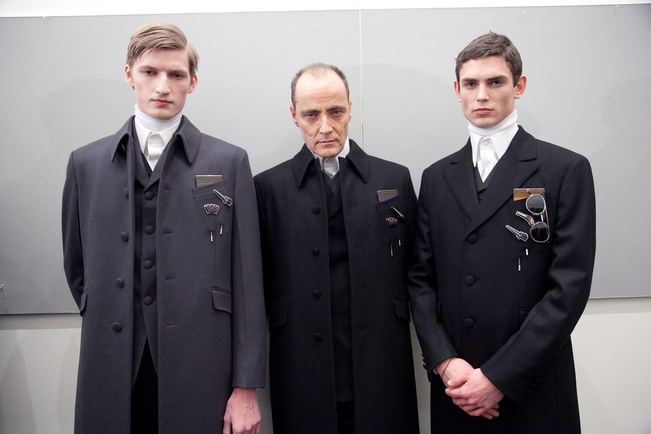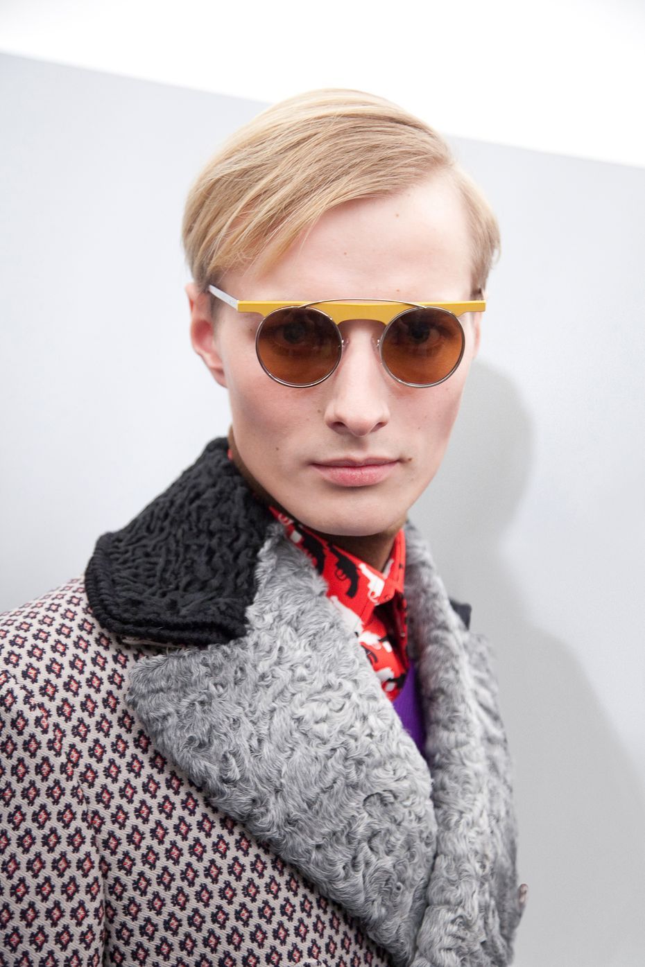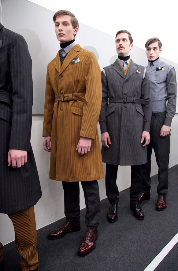 Here is a backstage look at the cool shades, pins and coats at the Prada Mens Fall Winter 2012 Fashion Show.