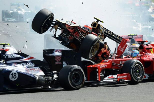 The Briton had nowhere to go and the concertina effect lifted Grosjean's car into the air and skimming across the front of championship leader Fernando Alonso's Ferrari, the Spaniard fortunate not to be hit on the head.