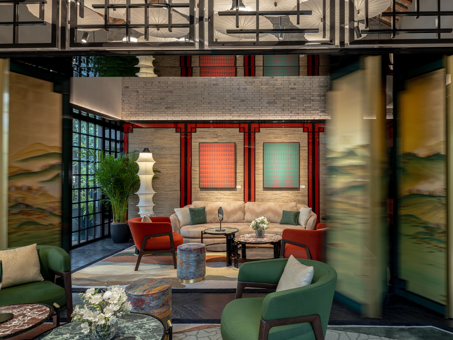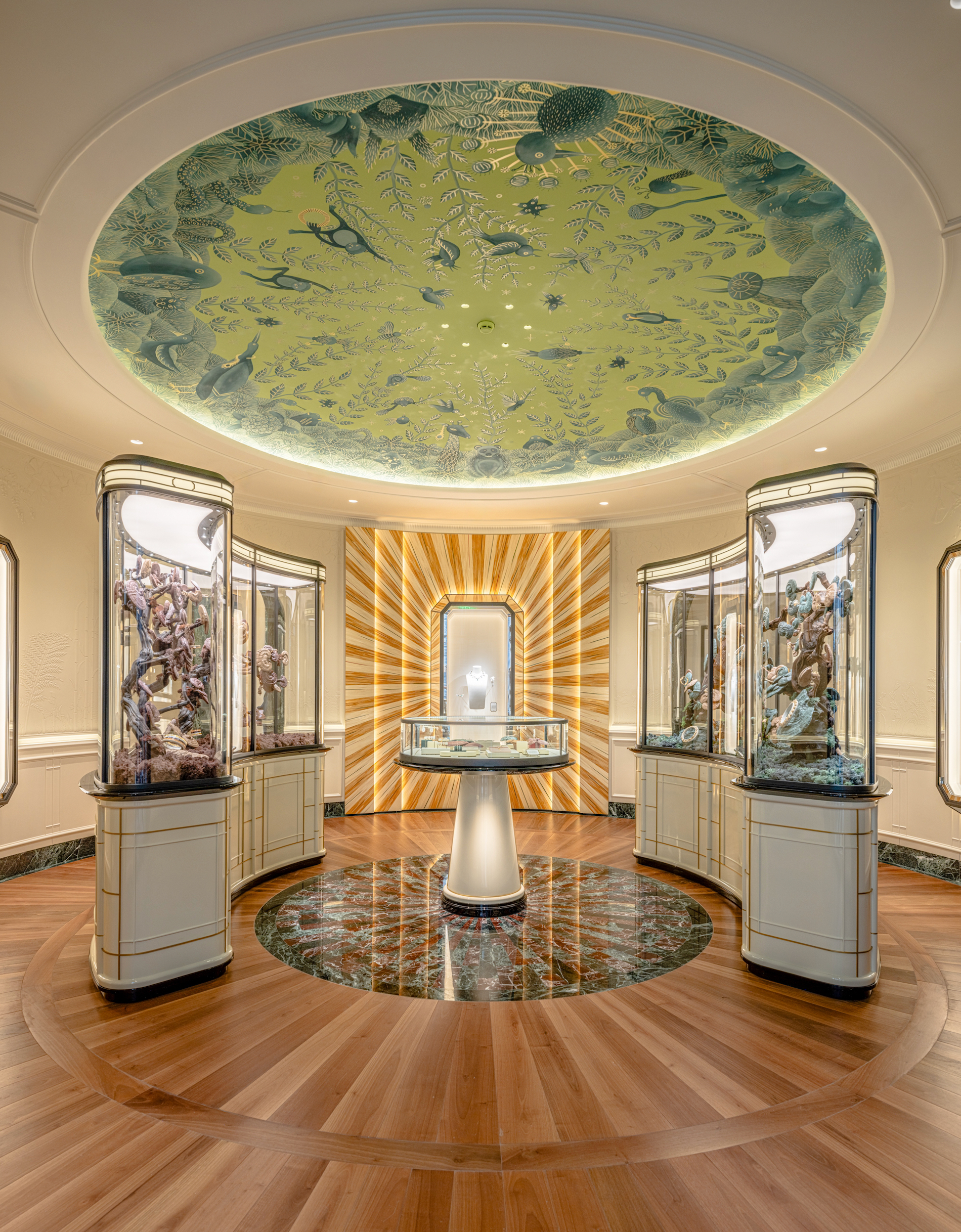 Inside, the cultural dialogue creates a sensory feast. A dramatic staircase features metallic prisms that shift from Boucheron’s iconic emerald green to auspicious Chinese red as guests ascend. The space is curated with exceptional artisanship, including straw marquetry by Olga Thune-Larsen and a celestial painted dome by artist Claire Nicolet.