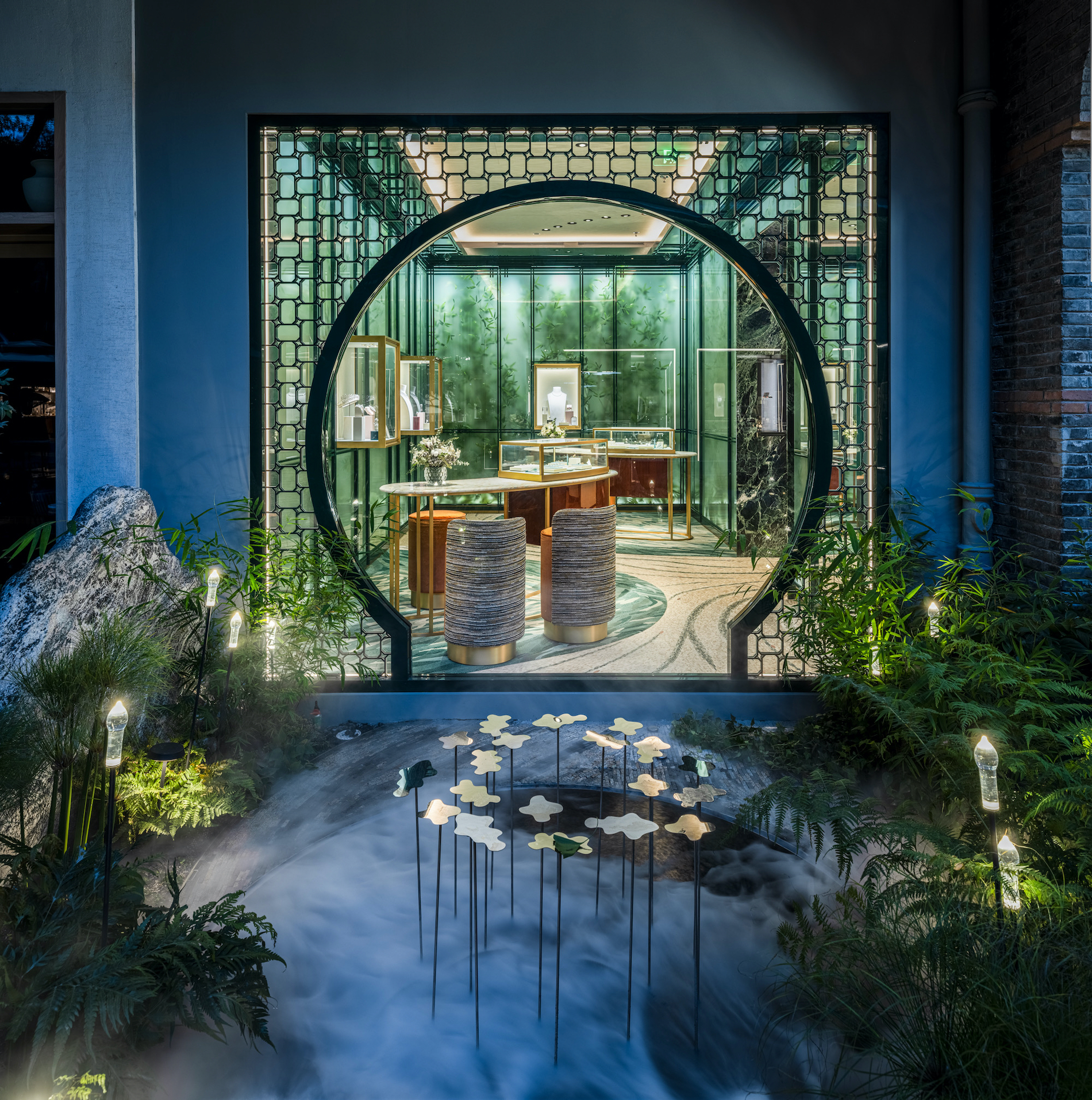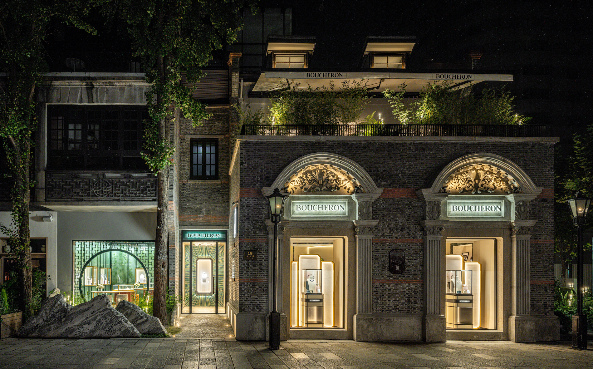 True to Boucheron's DNA, nature is the protagonist here. The boutique serves as a verdant oasis in downtown Shanghai, featuring a French winter garden that echoes the glass conservatories of 19th-century Europe. This Western botanical nod is balanced by a secondary entrance honoring classical Chinese gardens, complete with a traditional Moon Gate and flowing water features.