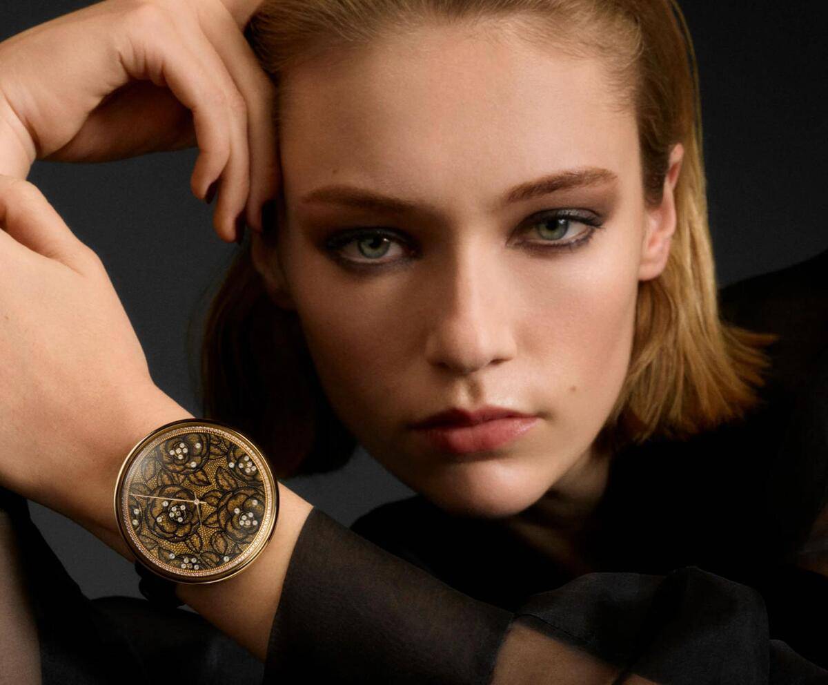 A lace design of camellias, created through a combination of three Métiers d’art: first, the technique of hand engraving to give texture to the yellow gold surface of the dial. This is then covered with a layer of translucent “Grand Feu” enamel to accentuate and highlight the delicacy of the engraving and endow it with infinite depth. Finally, the Creation Studio used the traditional decal technique to draw the motif.