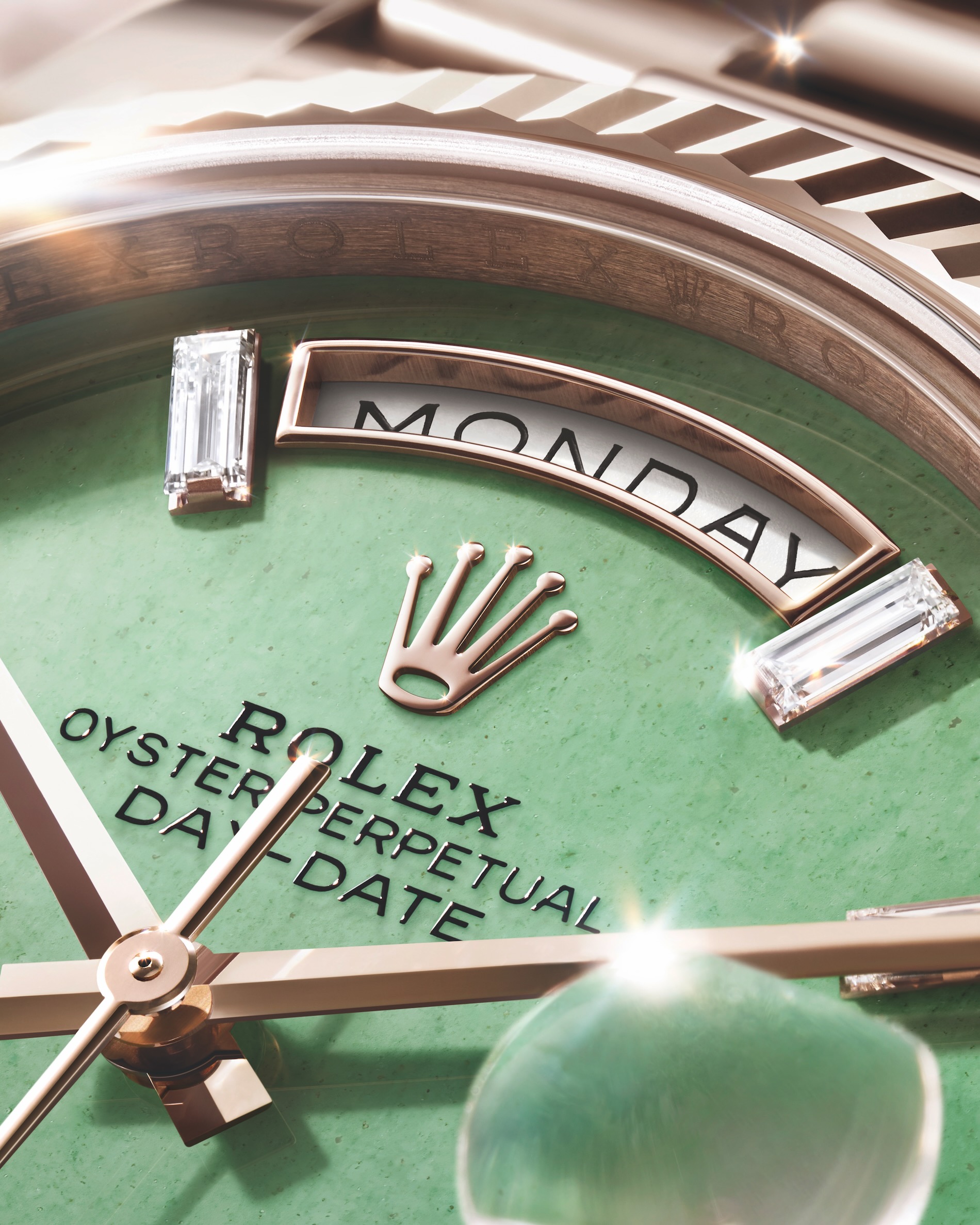 Symbolized by the iconic green seal, the Superlative Chronometer certification is strictly controlled by independent Swiss entities and is based on the brand's seven pillars of watchmaking excellence. This rigorous process guarantees excellent performance on the wrist, embodying the philosophy of perpetual excellence instilled by founder Hans Wilsdorf. The Day-Date 40 stands as a testament to this ethos, combining materials science and dial-making artistry to shape the watchmaking emotions of tomorrow.