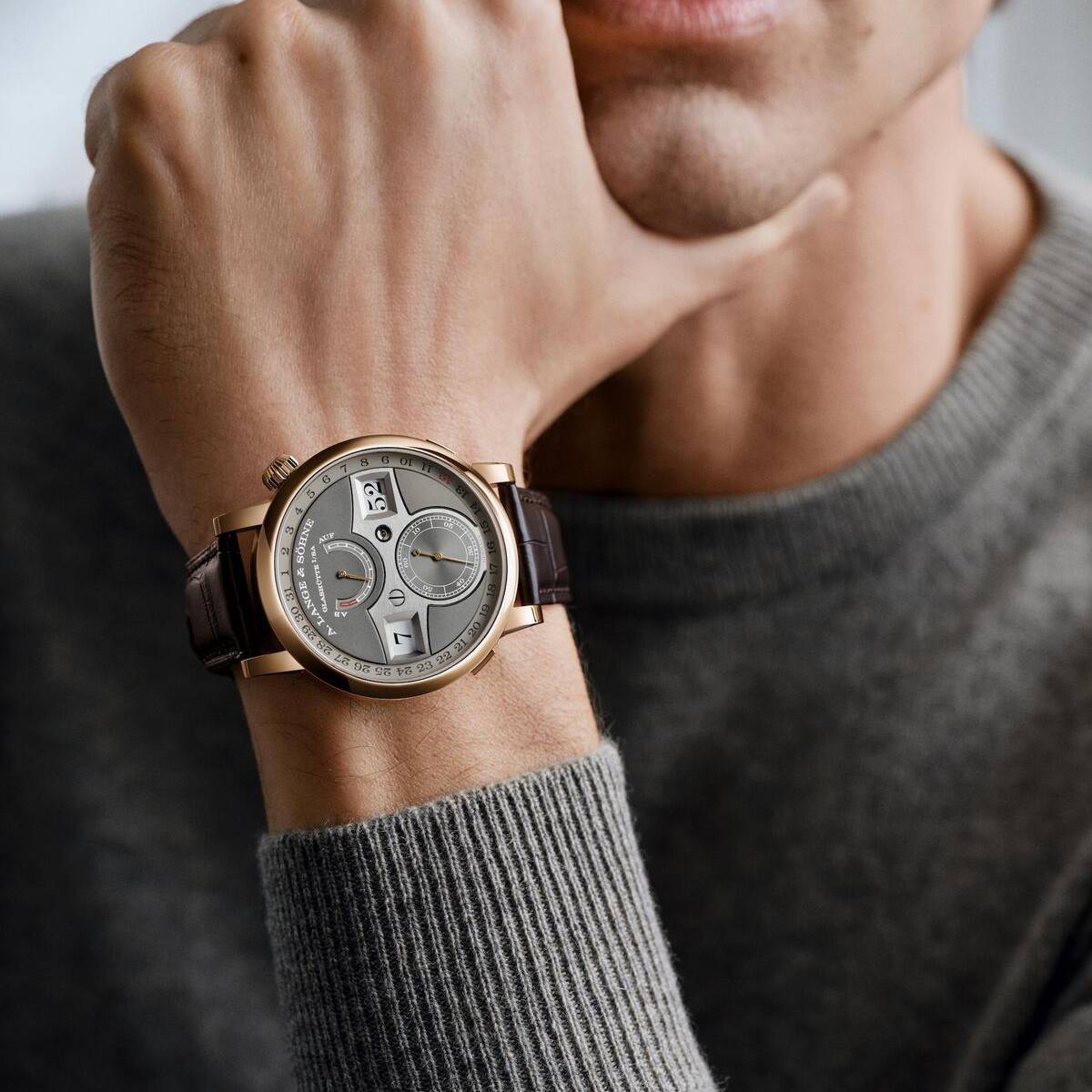 Anchoring this technical virtuosity is the time bridge, fashioned from German silver, which frames the displays and unites exterior design with interior mastery. Within, the calibre L043.8 beats with measured strength: twin mainspring barrels provide a 72-hour reserve, regulated by a patented constant-force escapement that ensures unwavering accuracy. At midnight, the movement orchestrates a rare spectacle — all numeral discs and the date ring advancing in perfect unison, a moment of mechanical theatre that can almost be felt as much as seen.
