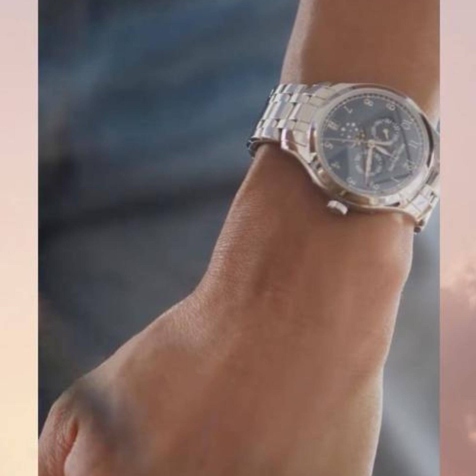 The shimmer of polished steel finds a perfect partner in an elegant midnight blue dial on this stunning Patek Philippe Annual Calendar reference 4947. The face features a refined shantung patterned satin finish that mimics the texture of fine silk to create a look of understated luxury. This interplay of cool steel and deep blue evokes the stillness of a summer sunset where the sky melts seamlessly from silver into indigo.