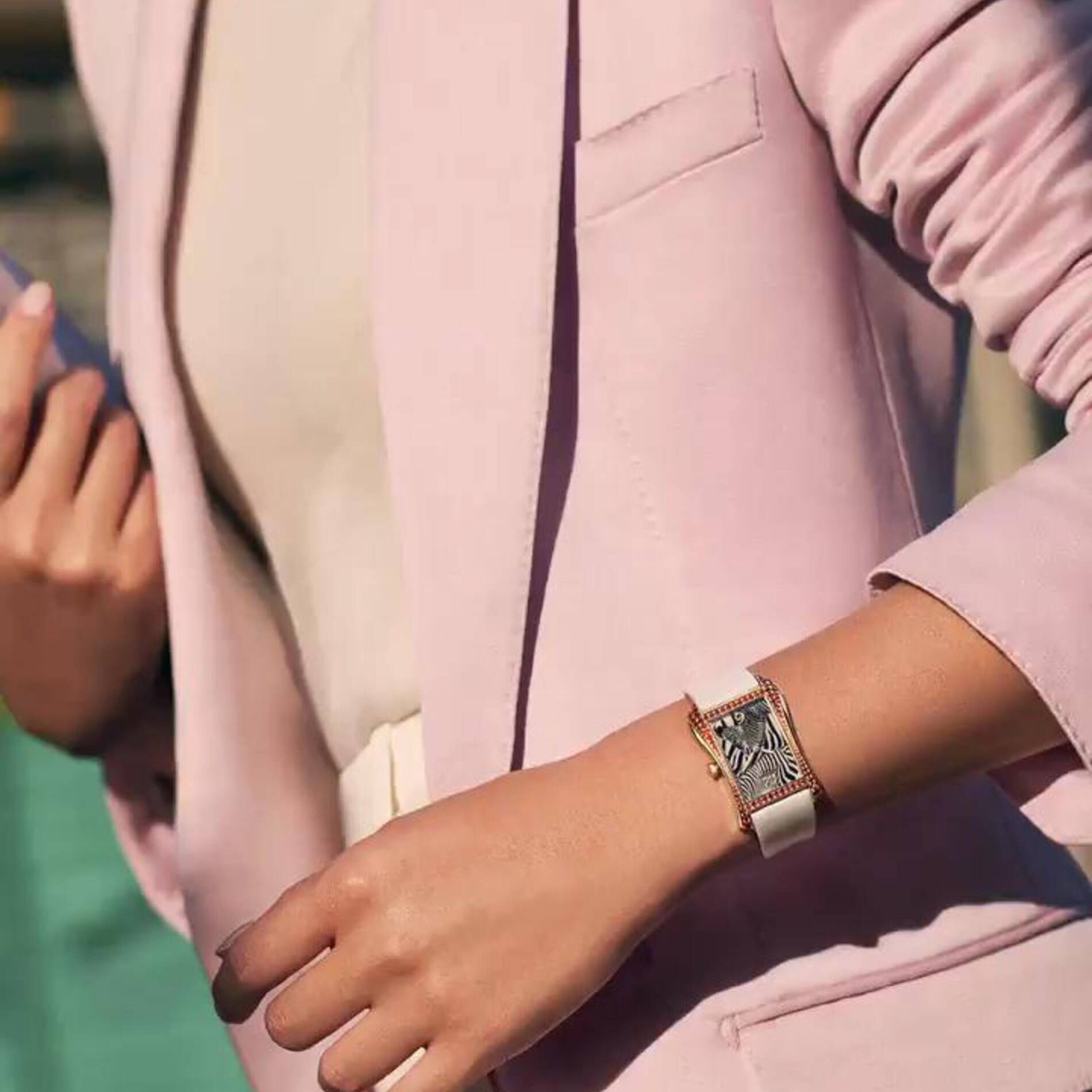 The latest Patek Philippe Gondolo Serata "Zebra" (Ref. 4962/200R) features a rose gold case hand-set with 94 brilliant-cut spessartites (2.02 cts). The gems are arranged in a double color gradient covering a spectrum from cognac shades at 12 o'clock and 6 o'clock to tangerine tones at 9 o'clock and 3 o'clock.