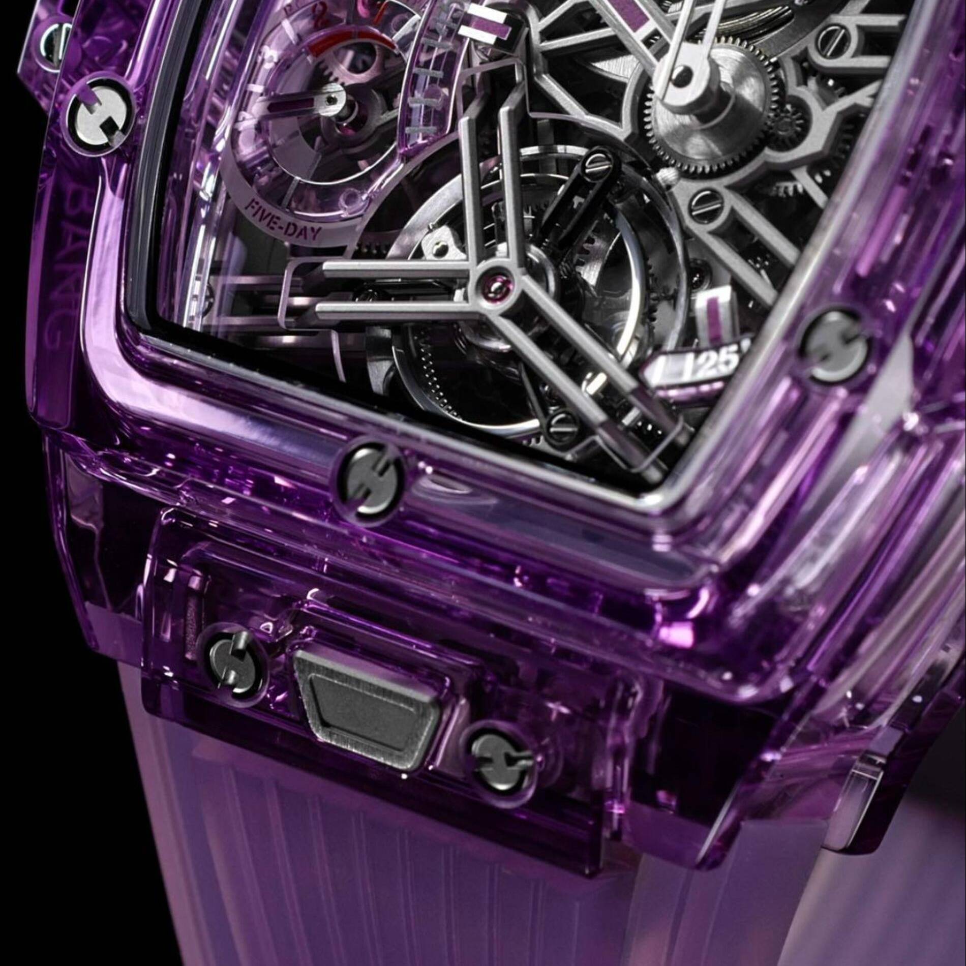 The industry first of purple-colour sapphire from Hublot, first seen on the Big Bang Tourbillon Automatic is now deployed on the Spirt of Big Bang Tourbillon 5-Day Power Reserve. This new purple tint is a composite made of Al₂O₃ (aluminium oxyde) and chrome, with the case and movement blending together seamlessly.